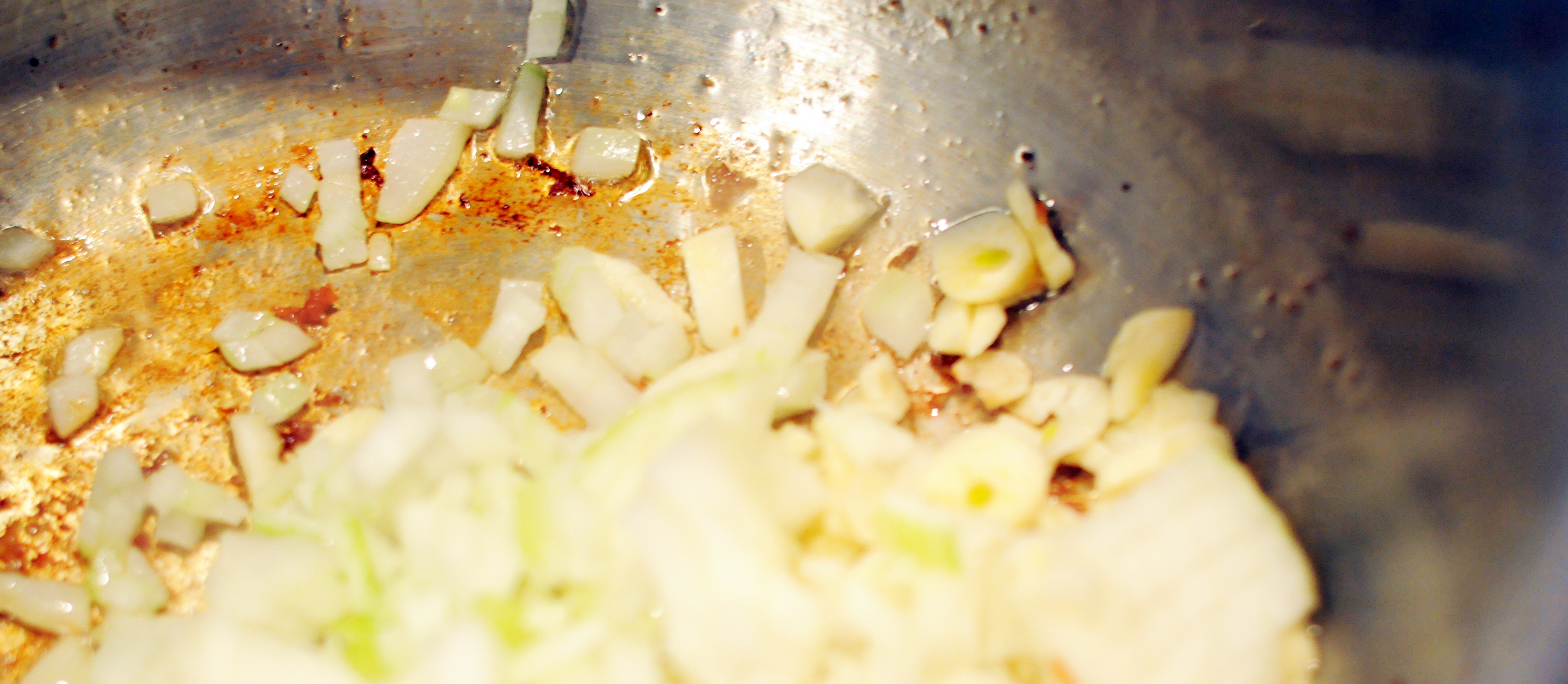 5. Løk og hvitløken stekes deretter til blanke og transparent. Du kan om du vil ha en tykkere saus, tilsette noe hvetemel nå sammen med litt smør.
