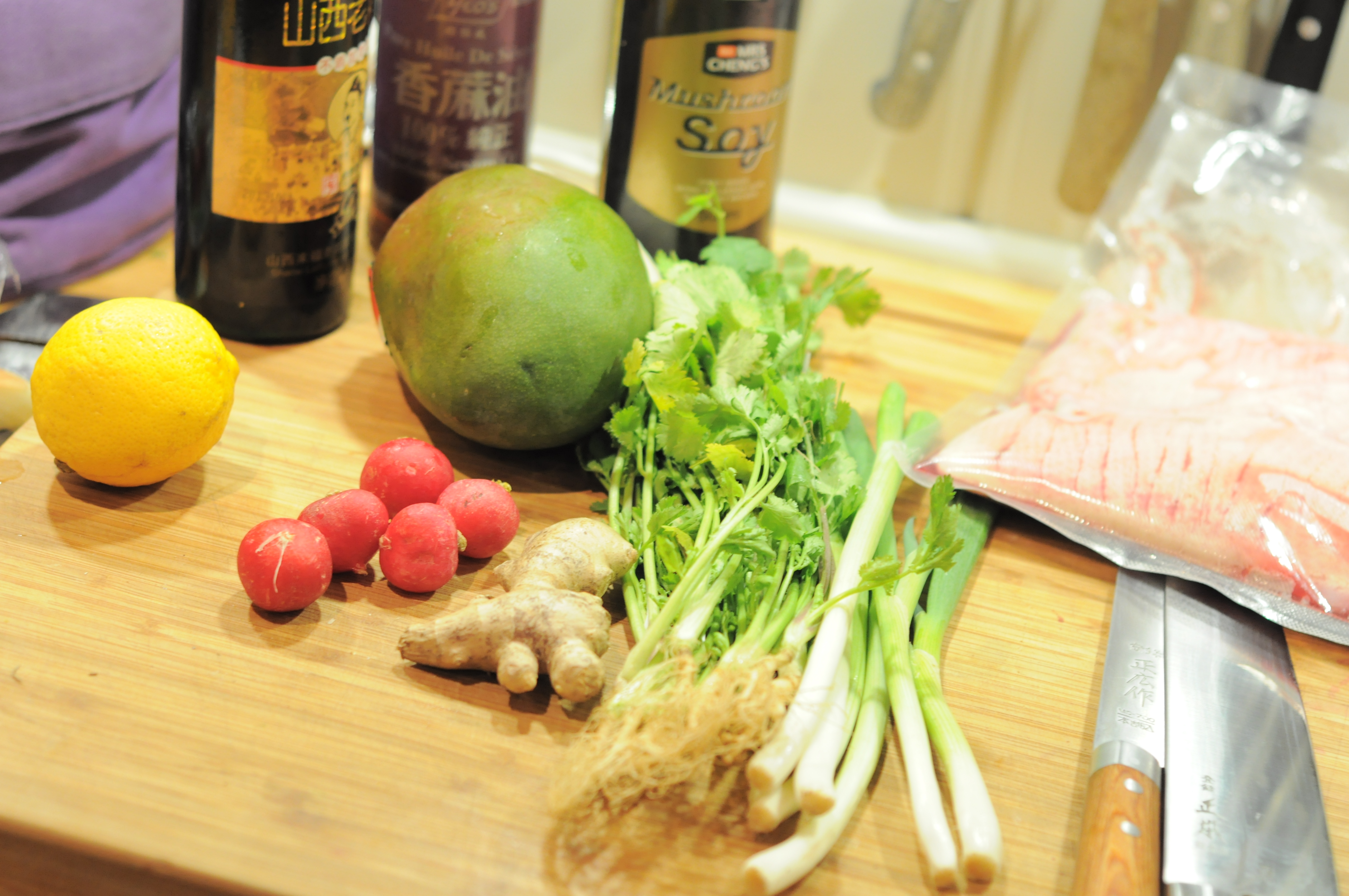 - Imens skjærer du opp salaten. Mangobiter, koriander, redikker og vårløk blandes enkelt og dekkes lett med litt soyasaus.