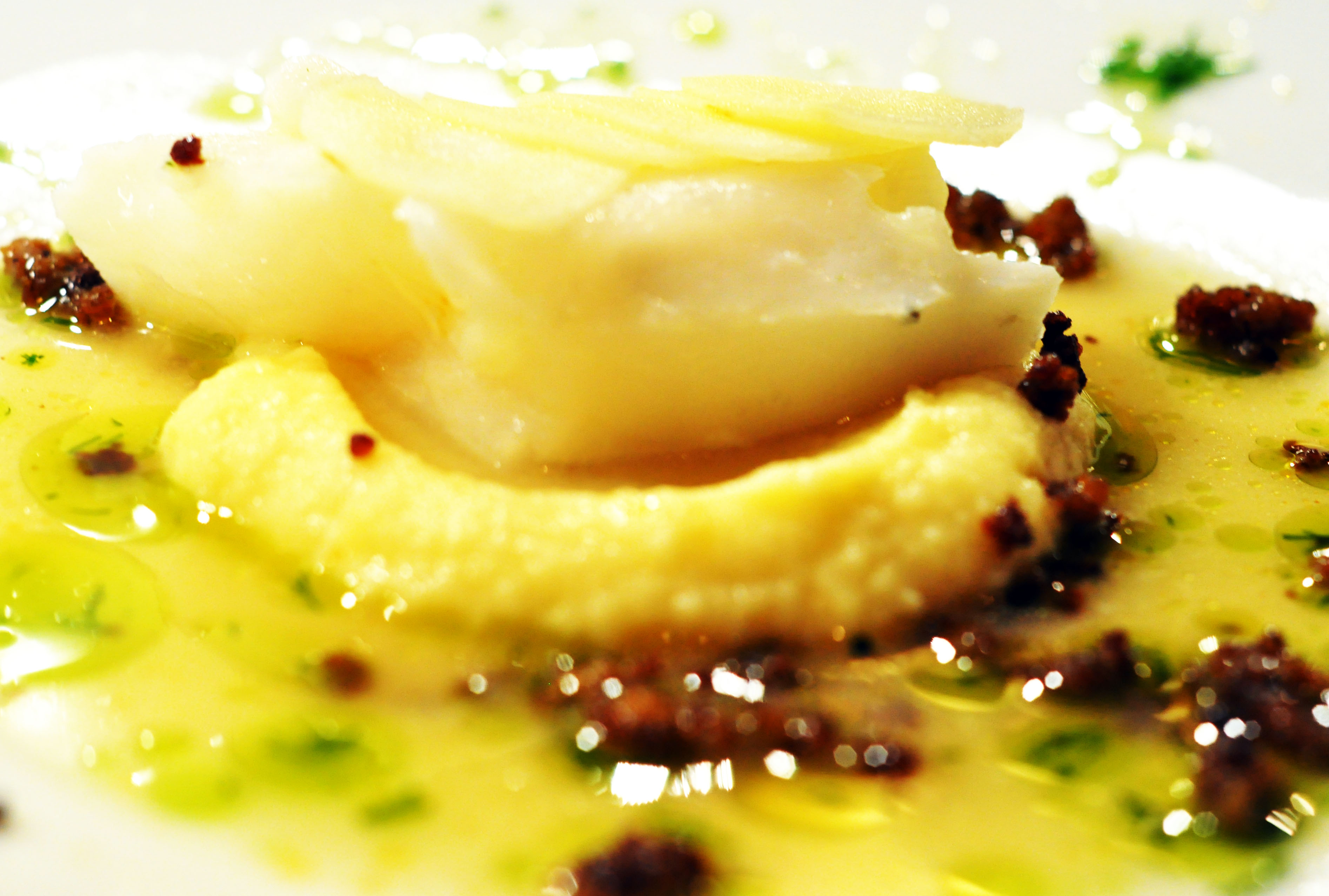 2 kommentarer om “Sous Vide skrei, blåskjellkraft, pastinakk puree, syltet pastinakk, chorizo og dill olje”
