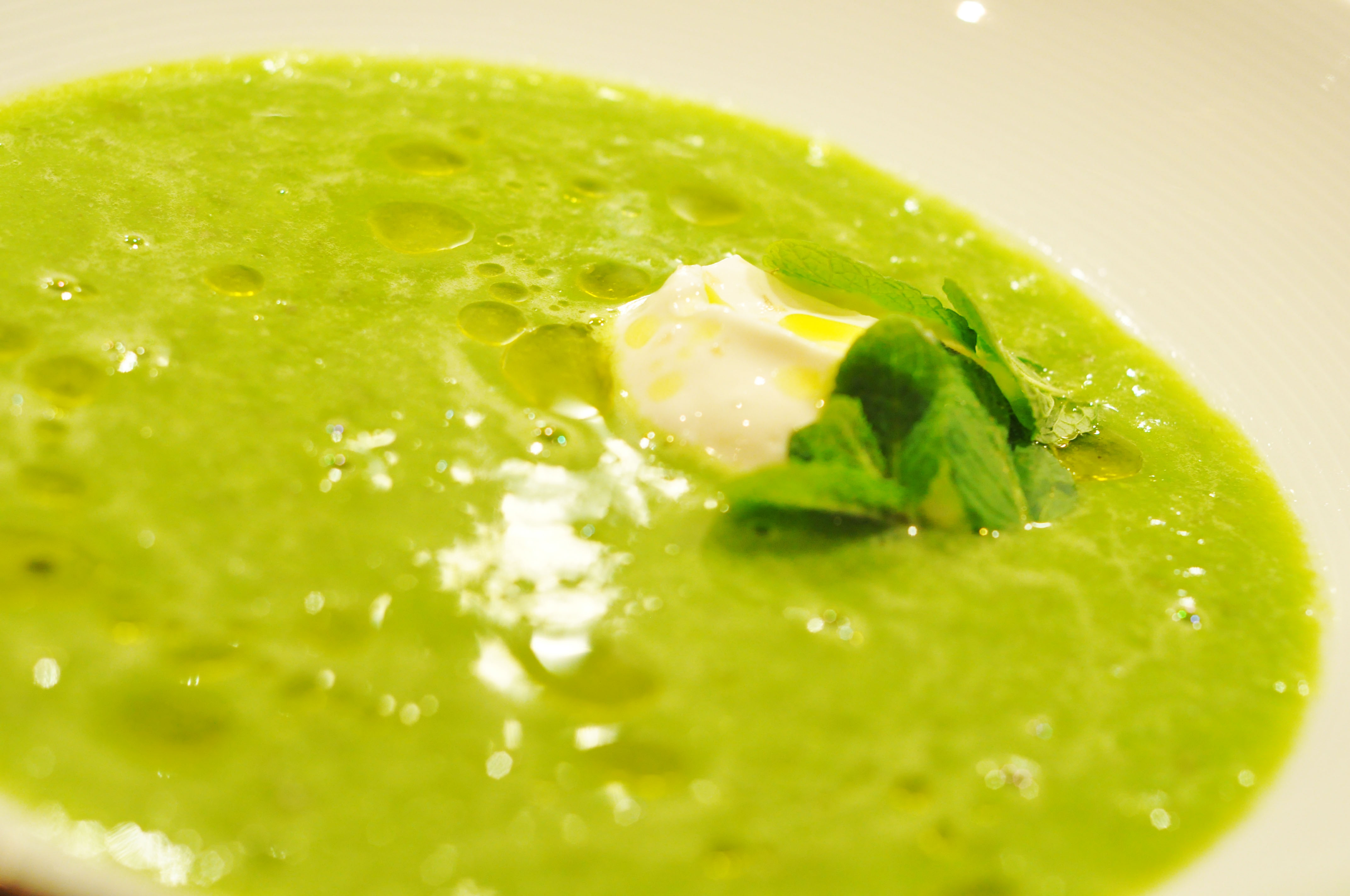 7. Legg deretter ricotta i bunn av en tallerken, hell deretter over suppen, legg til myntebladene, salt og olje (eventuelt litt sitronskall).