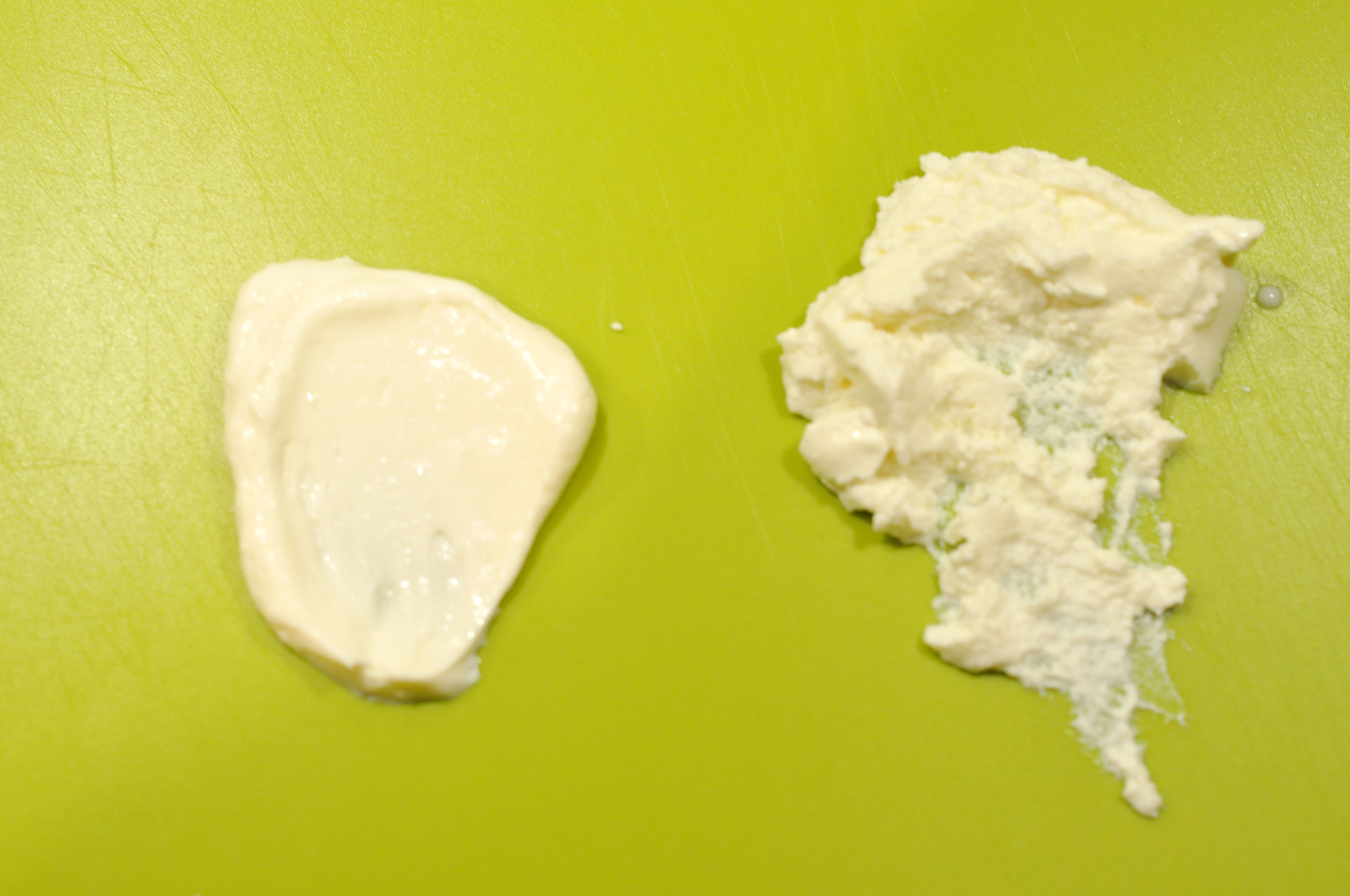 3. Mens microen kjører, tar du ricottaen og kjører denne glatt med stavmikser eller blender eller lignende. Forskjellen mellom den som er kjørt glatt og direkte fra boksen ser du under: