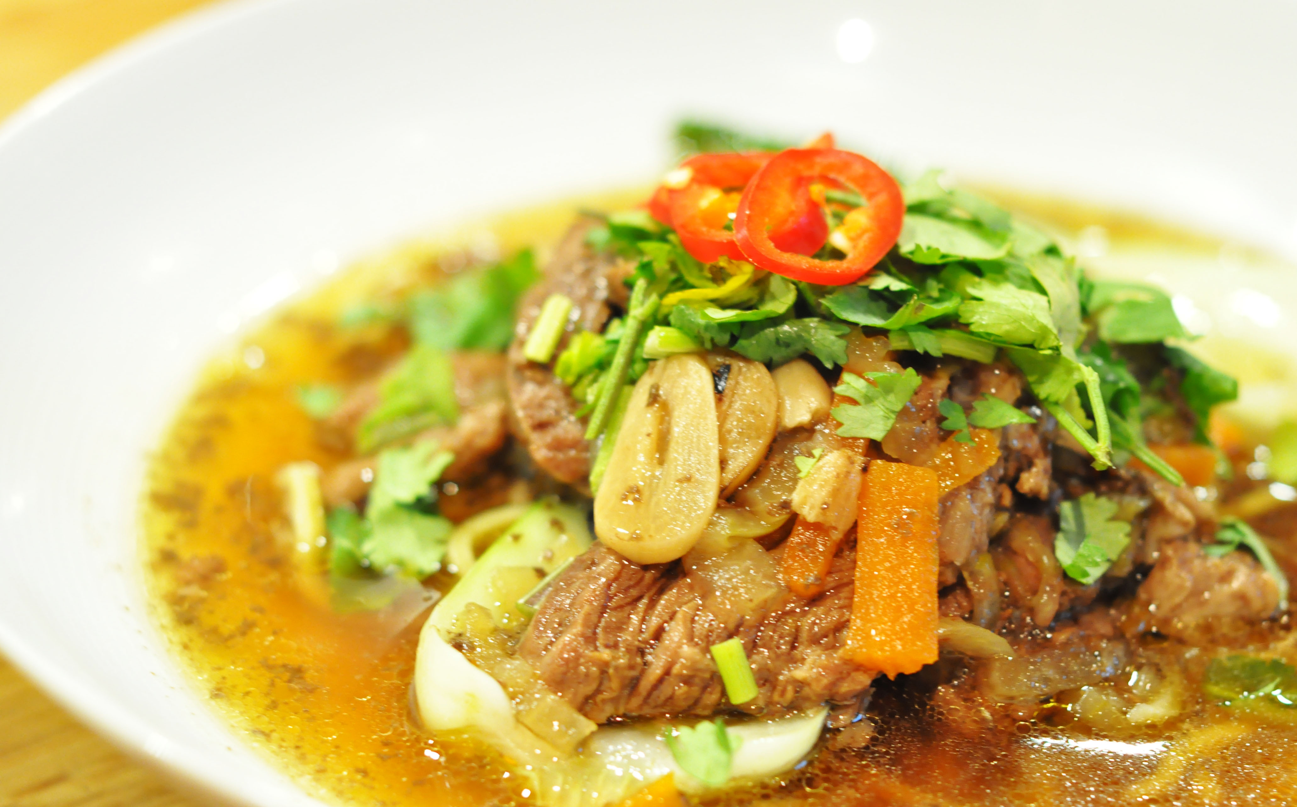 10. Legg nudlene nederst i en dyp skål og hell suppen over. Legg noen blader med koriander over (eventuelt masse om du er som meg) og eventuelt litt finkuttet chili.