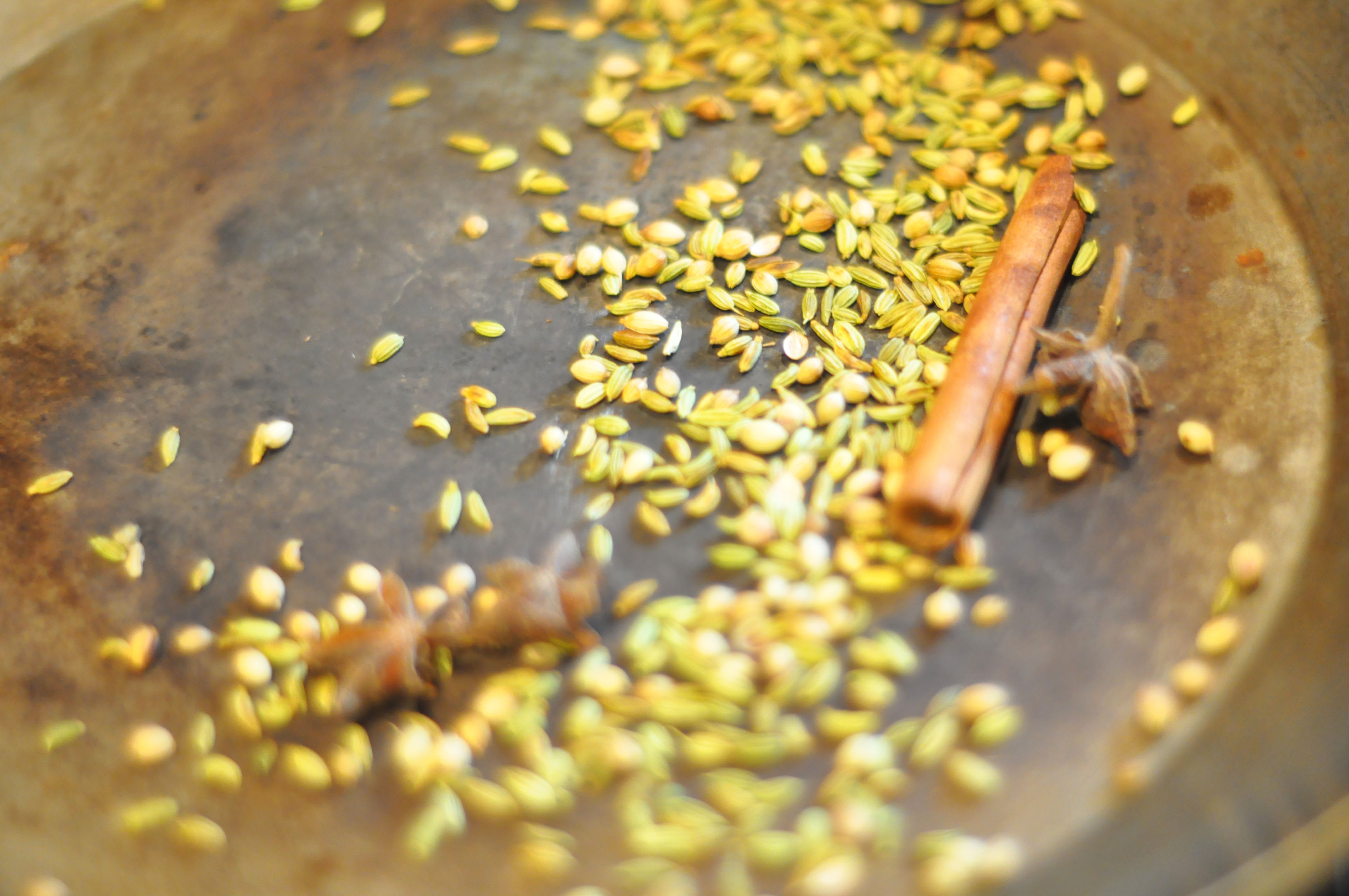 4. Tilsett krydderet i den tørre pannen og la de varme seg litt.