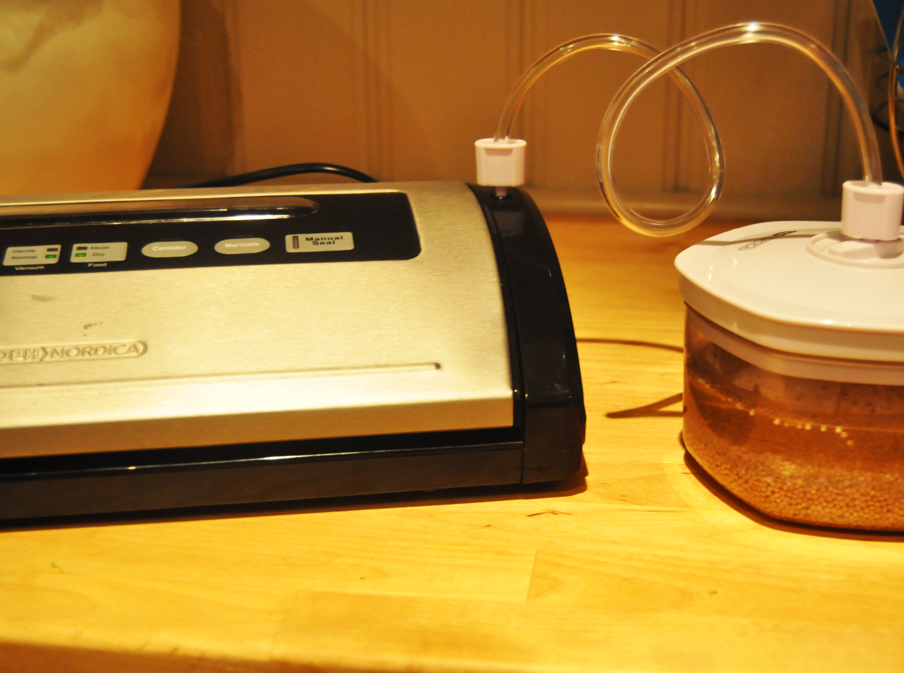4. Når du har kokt og helt av nok ganger til at sennepsfrøene ikke føles bittert, legger du frøene i laken i en lufttett boks og lar stå i kjøleskap klart til bruk. Jeg benytter her mine nye og fabelaktige vakuumbokser som jeg er meget fornøyd med.