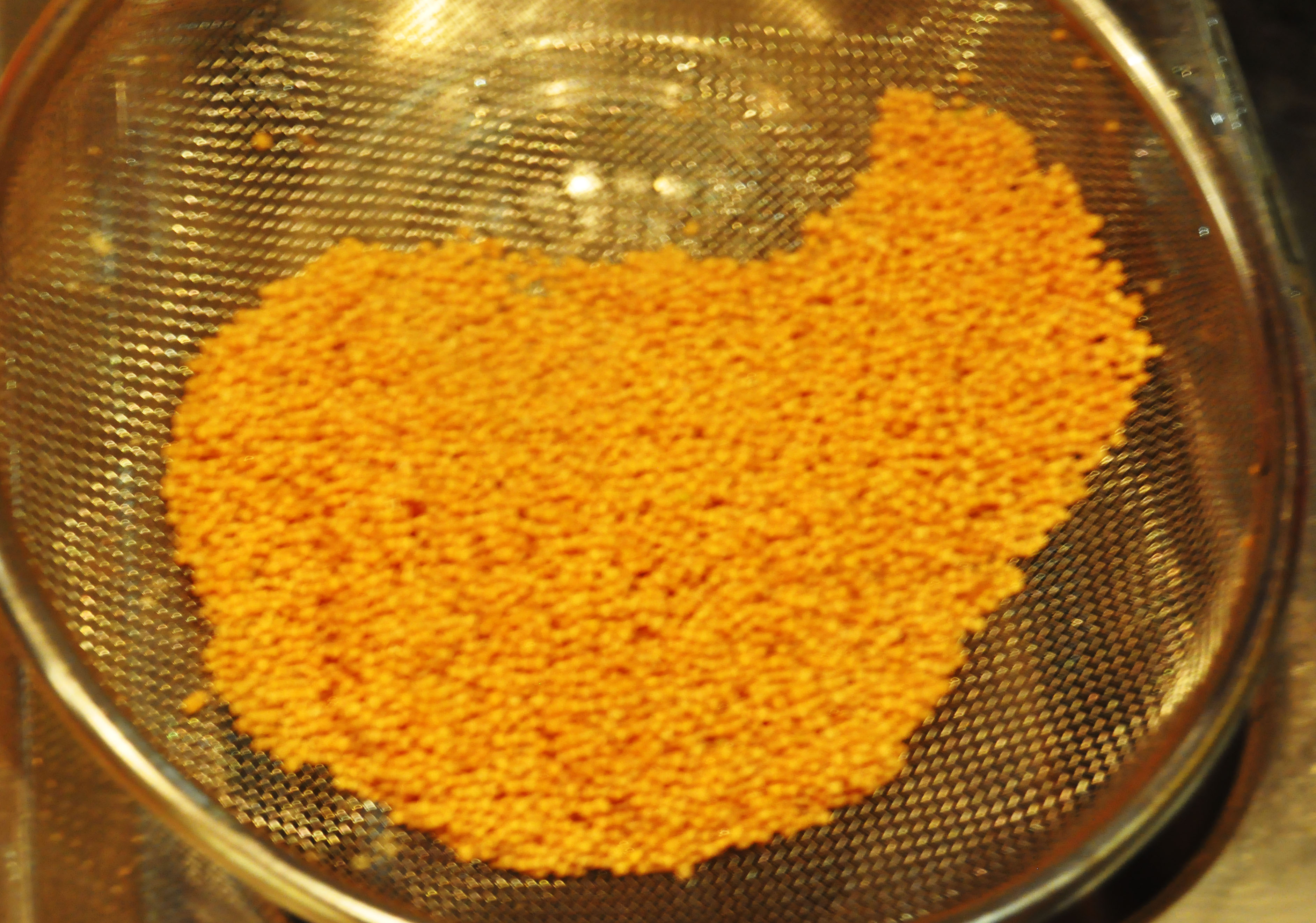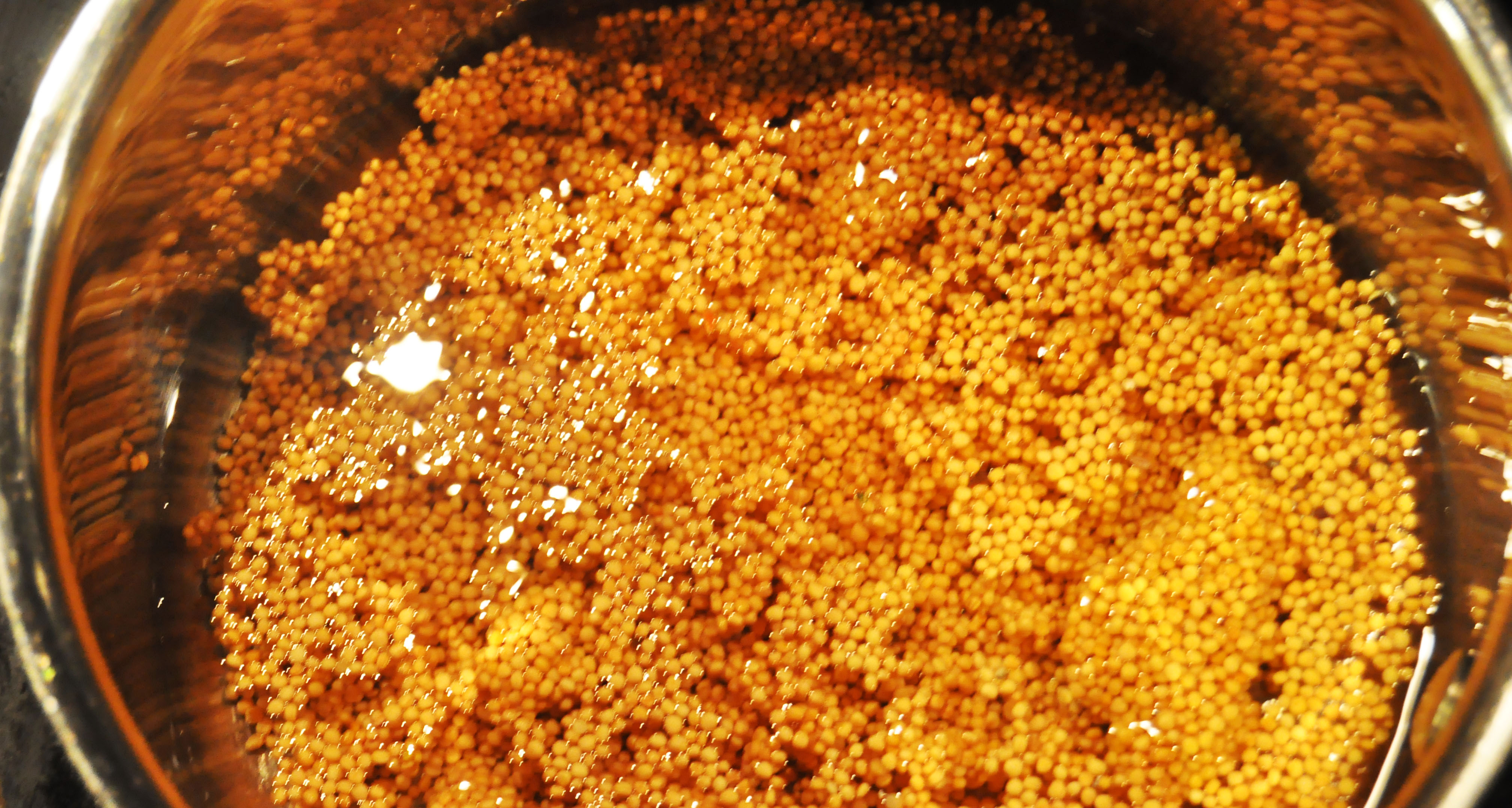 3. Når vannet koker, heller du av vannet og sennepsfrøene, tilsetter sennepsfrøene tilbake i kaserollen og dekker med vann igjen. Gjenta dette 6-8 ganger for å fjerne bitterheten i sennepsfrøene. Smak på de underveis og du skjønner når det er klart.