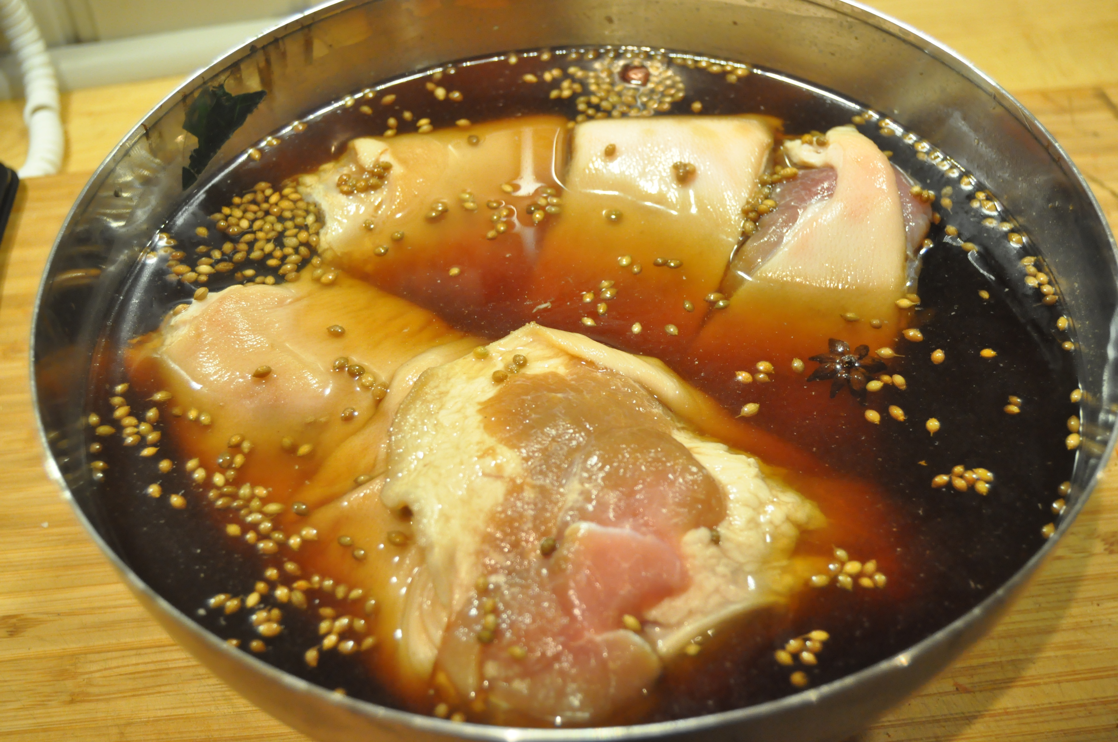 1. * For langtids tilberedningen så lager du først laken ved å blande vann, sukker, honning, salt, korianderfrø og liquid smoke. La deretter knokene ligge i laken i minst 95 timer i kjøleskap.