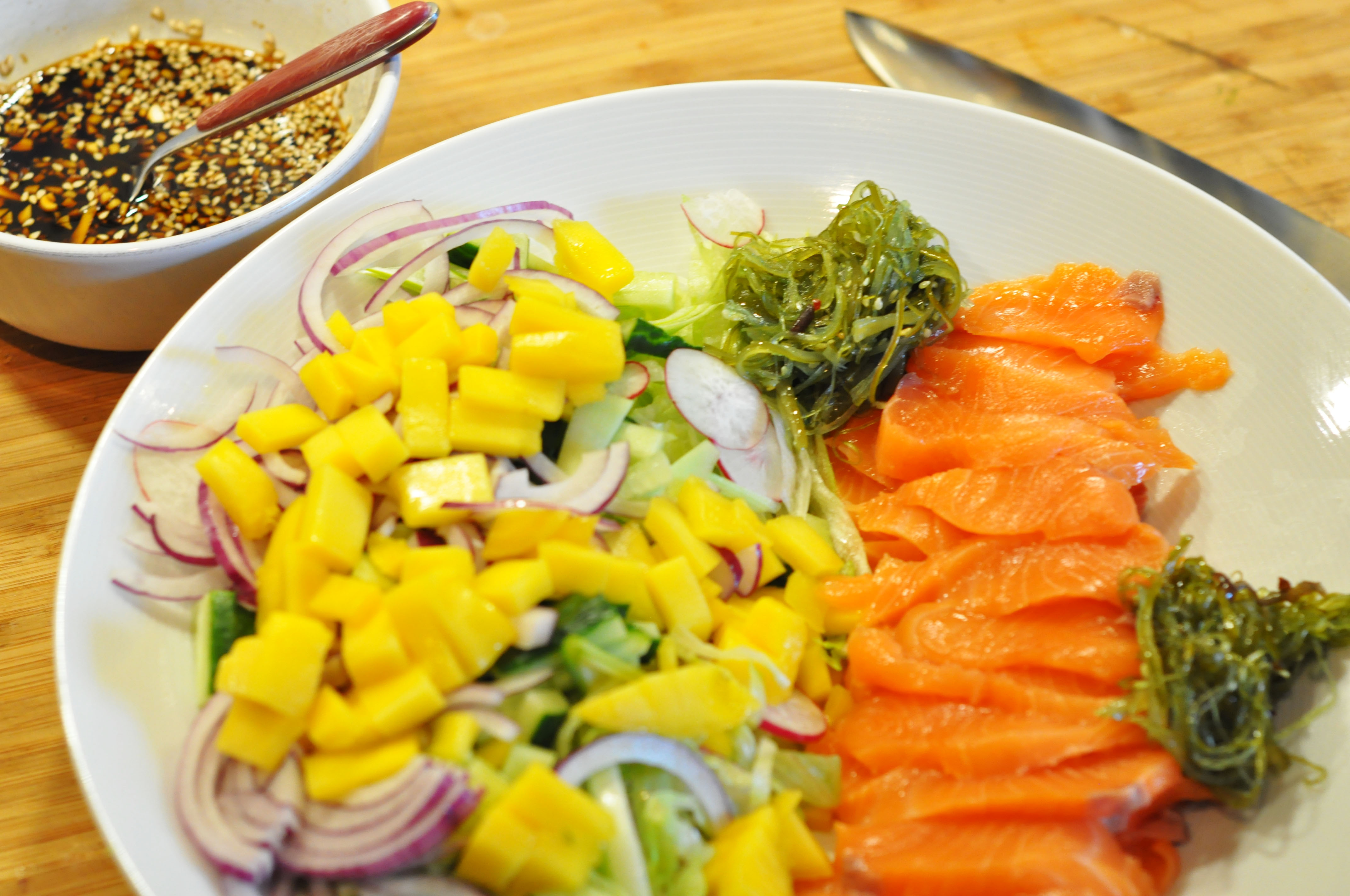 2. Kutt deretter opp grønnsakene som mango, avakado, salat, vårløk, rødløk i fine størrelser og tilsett litt sesamfrø og korianderblader og en skvis med sitron.