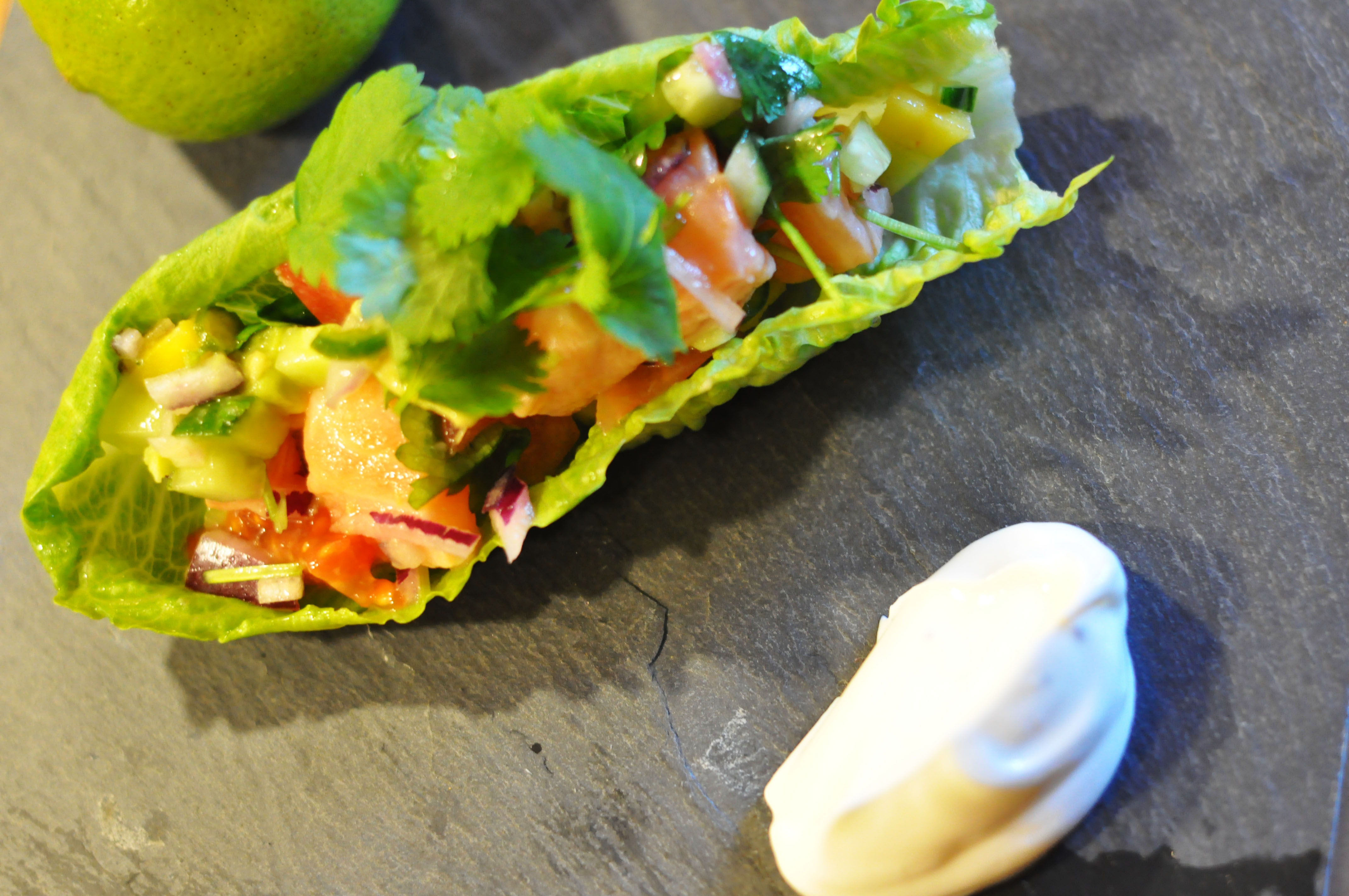 Maten er klar, og legg litt ceviche opp i salatbladet, og server med yoghurten.