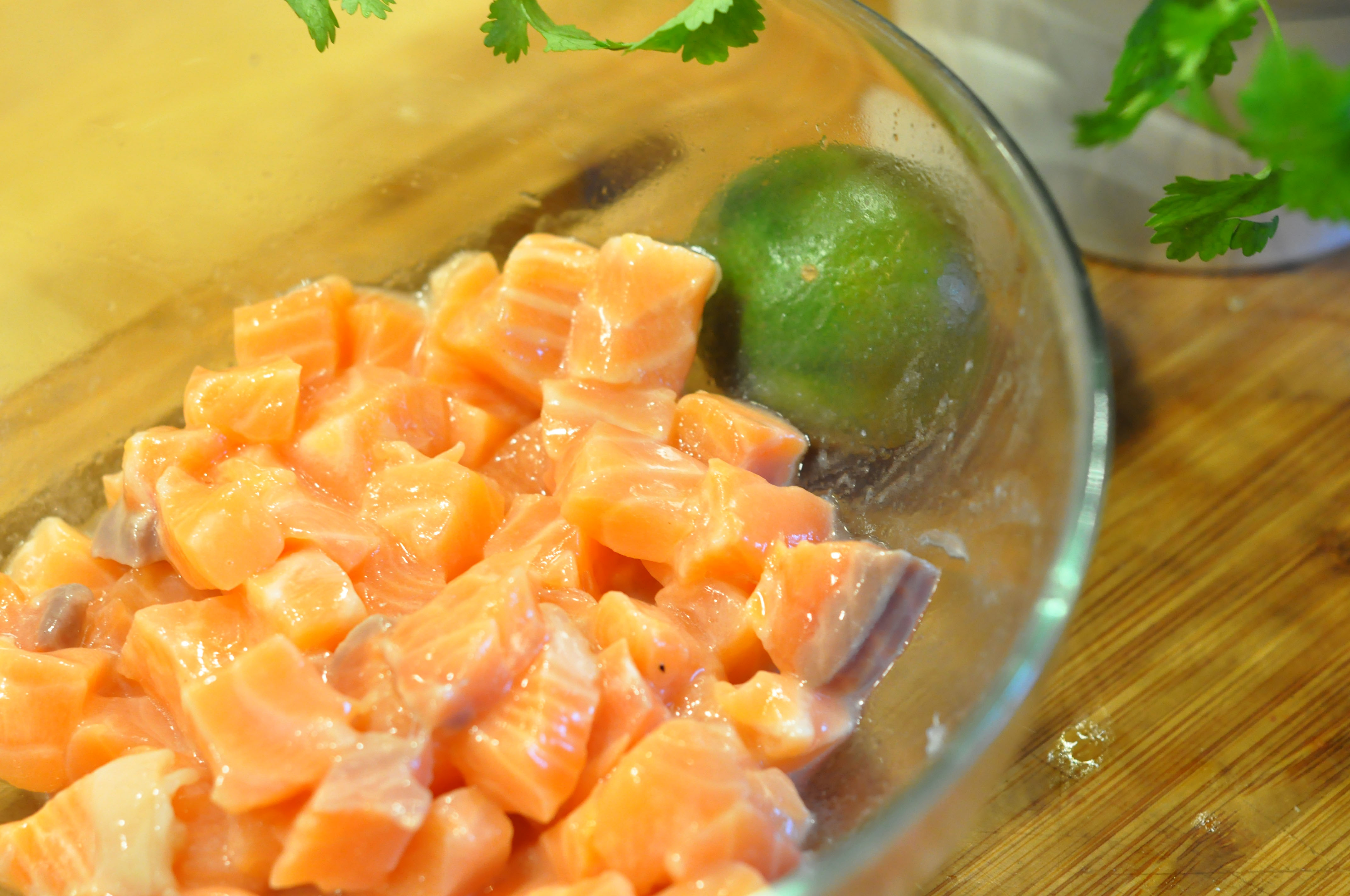 2. Legg laksen i en bolle og skvis over limen og la stå i 15-20 minutter. Smak til og se når du syntes den er passe «kokt»
