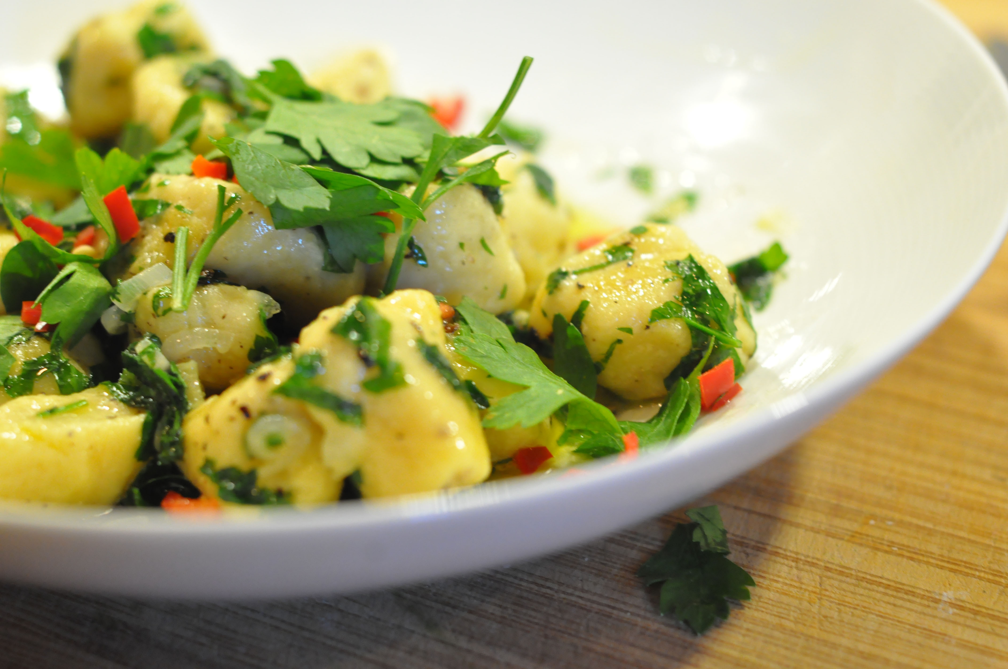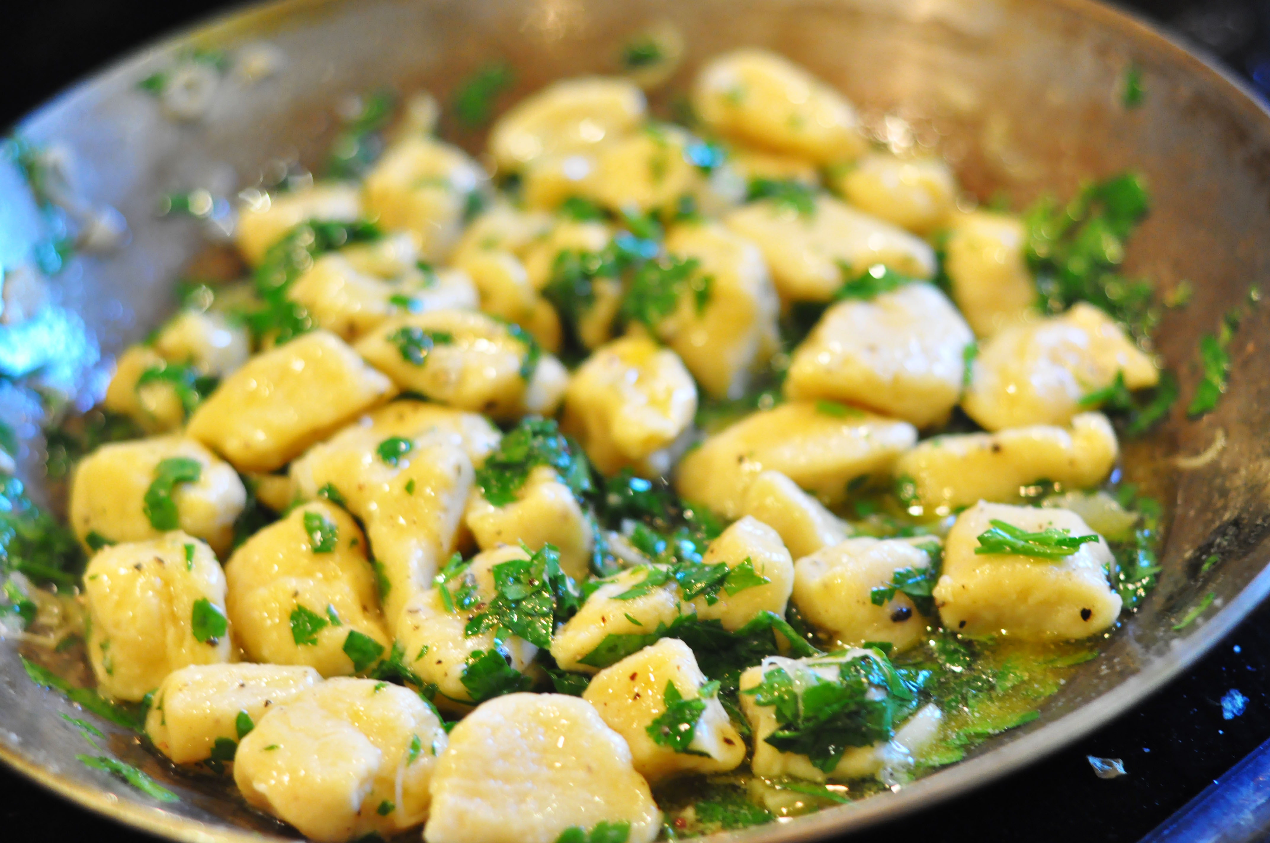 7. Mens gnocchien trekker i vannet smelter du smør sammen med hvitløk og sjalottløk i en stekepanne. la smøre sakte bli lysebrunt. Tilsett så persillen. Helt til slutt tilsetter du gnocchien oppi stekepannen og lar det ligge og kose seg en stund.