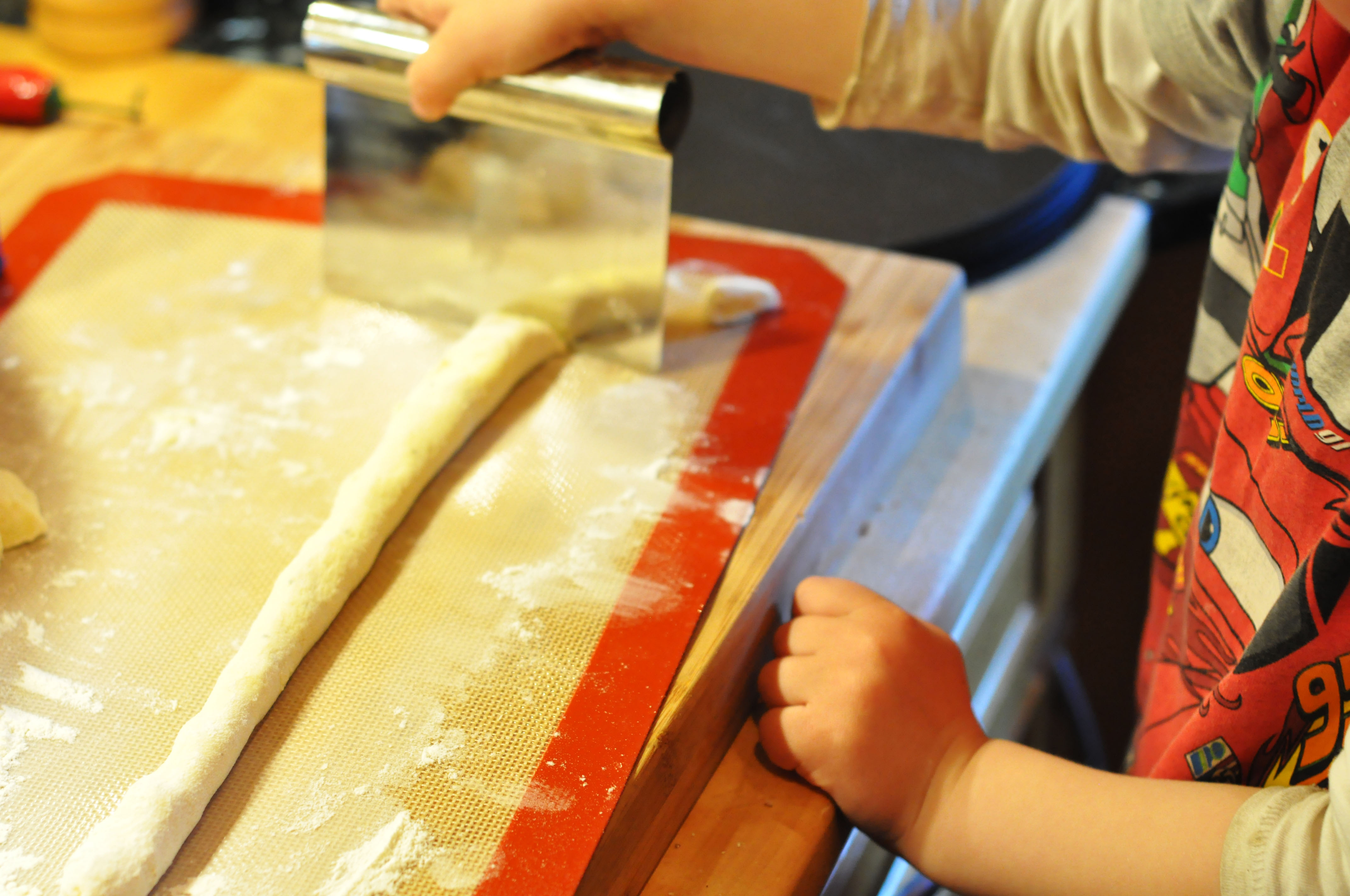 5. Ta deretter litt mel på en benk eller fjøl og ta en del deig og rull til en pølse og del opp i små puter.