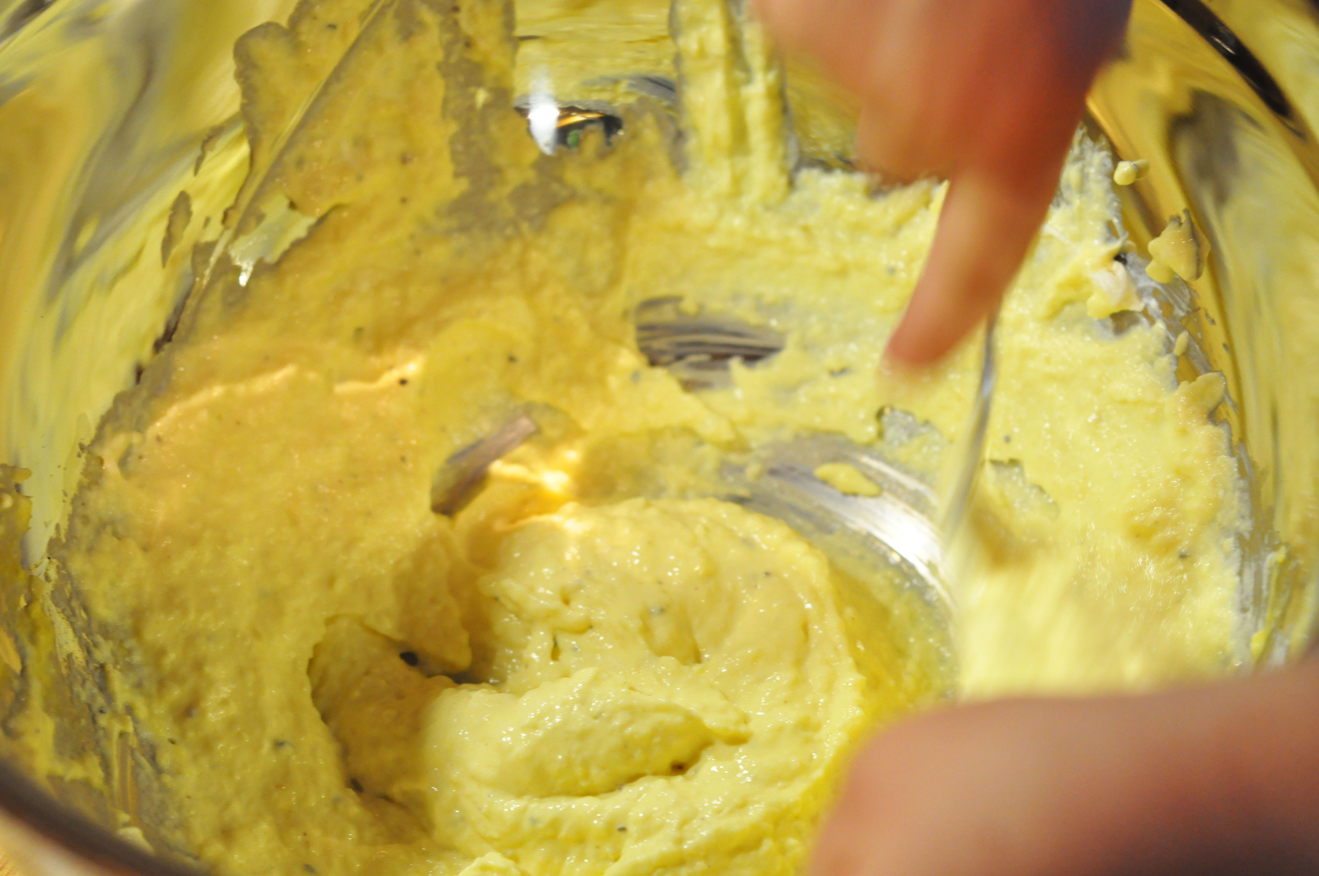 3. Tilsett muskatnøtt, salt og pepper og tilsett egget og eggeplommen og rør godt inn.
