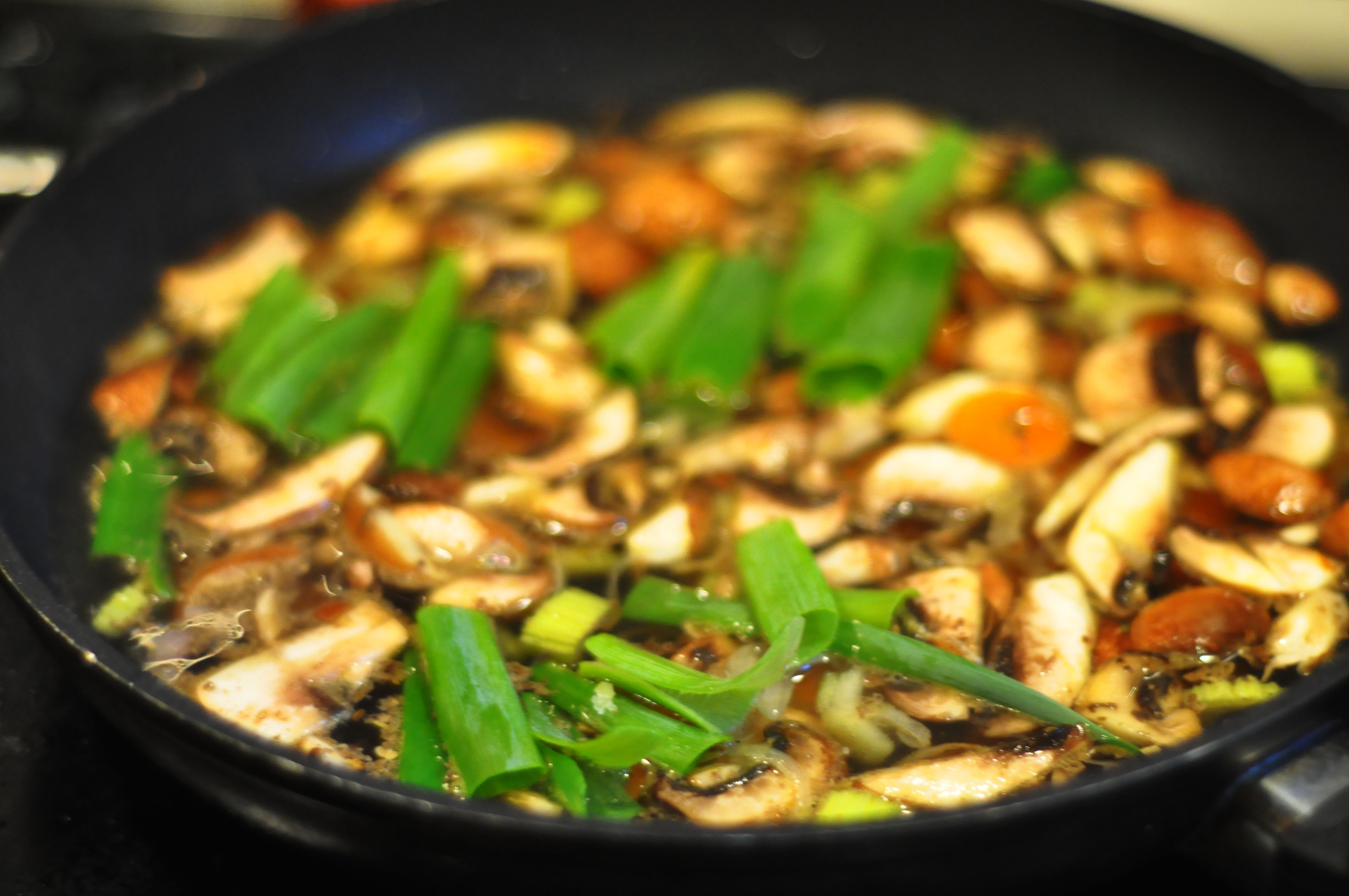 3. Mens potetene står og gjør sitt, starter du på soppkraften. Stek sjalottløk, gulerot og stangselleri i en stekepanne. Tilsett deretter soppen, både den tørkede og den friske, og stek en liten stund. Tilsett så vann og la stå og småkoke i 20 minutter.