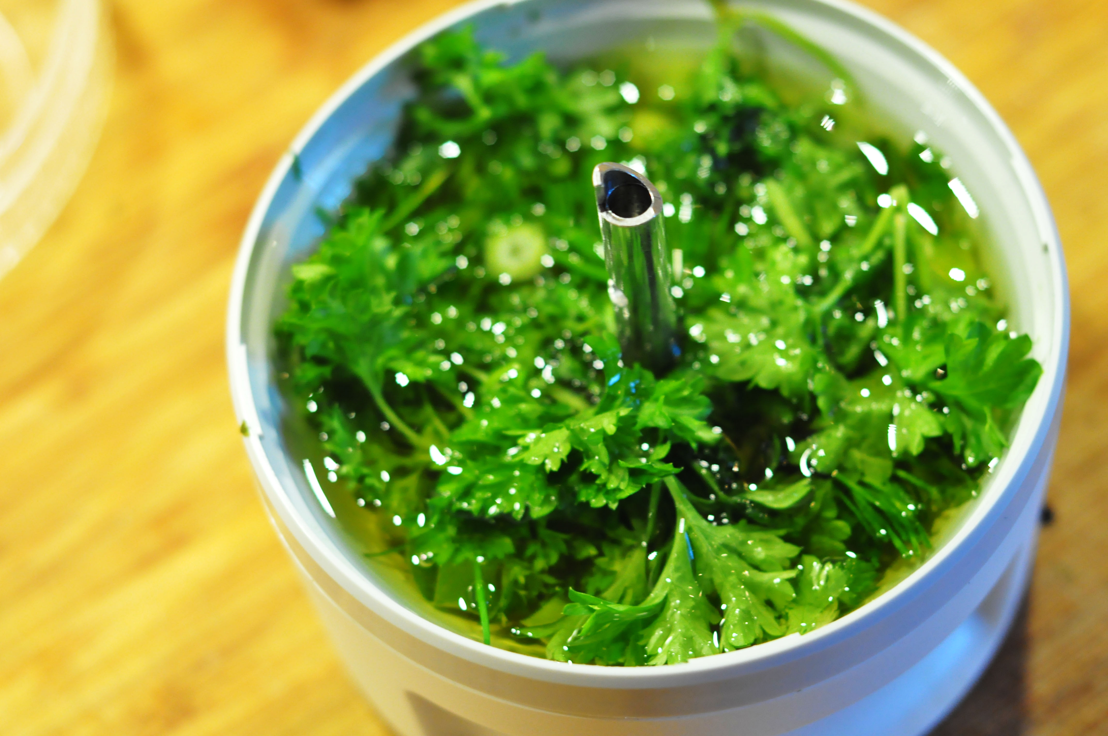 4. Lag nå urteoljen. Ta persille, gressløk og vårløk og kjør i en blender eller stavmikser eller lignende med oljen. La stå en stund og sil av. Hell over på flaske. Du lager nå mer enn du trenger så du kan bare la denne stå i kjøleskap til senere bruk. Det er jo nesten chimichurri, så bruk den alene eller tilsett mer og du ha en god saus til alt mulig rart.