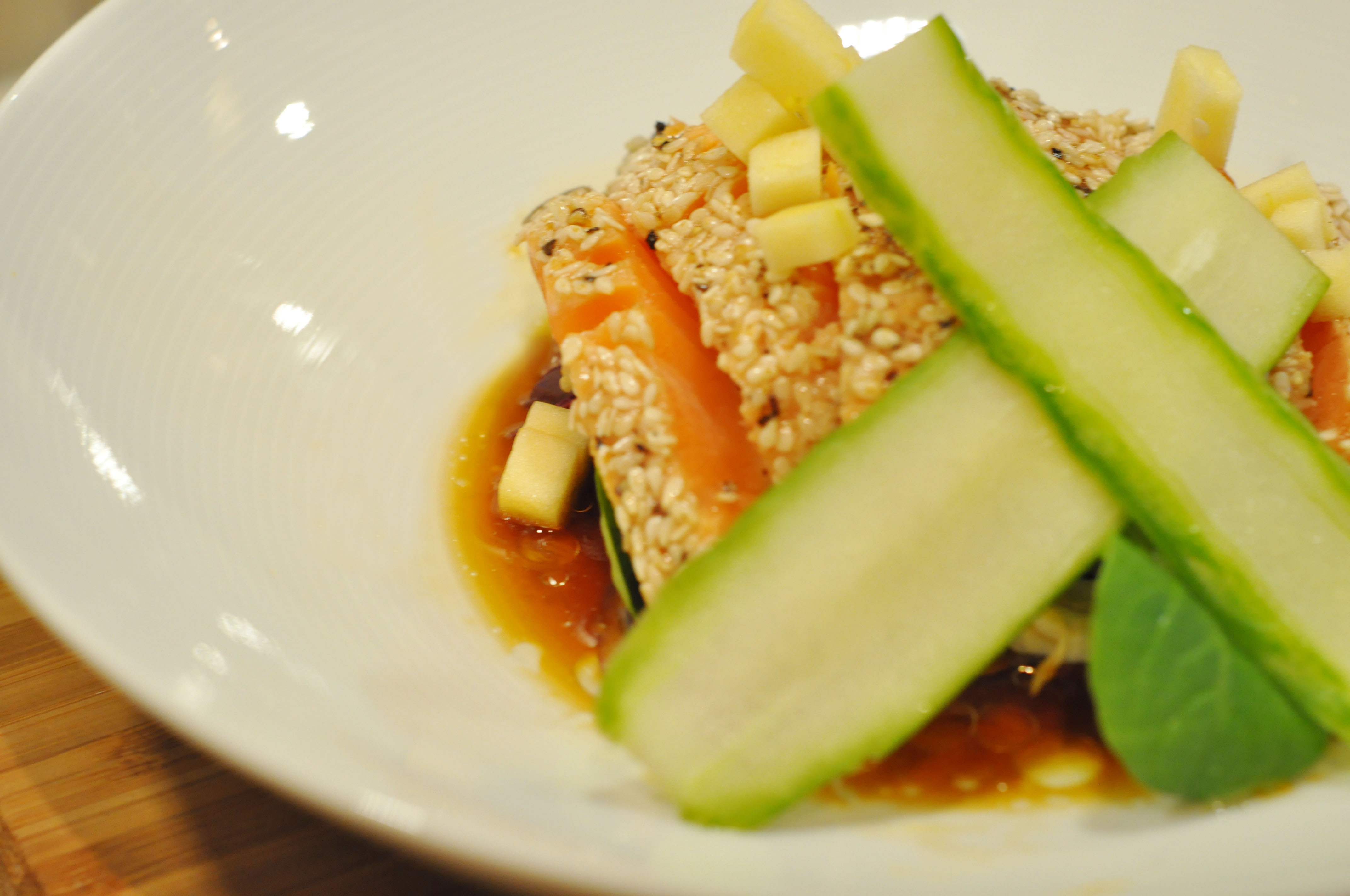 Til denne har jeg gått for asiatiske smaker, men smelt på med rå og knasende grønnsaker. For å matche opp den syrlige og salte sausen, legger vi på noen fint oppkuttet eplebiter som gir friskhet og litt sødme til retten.