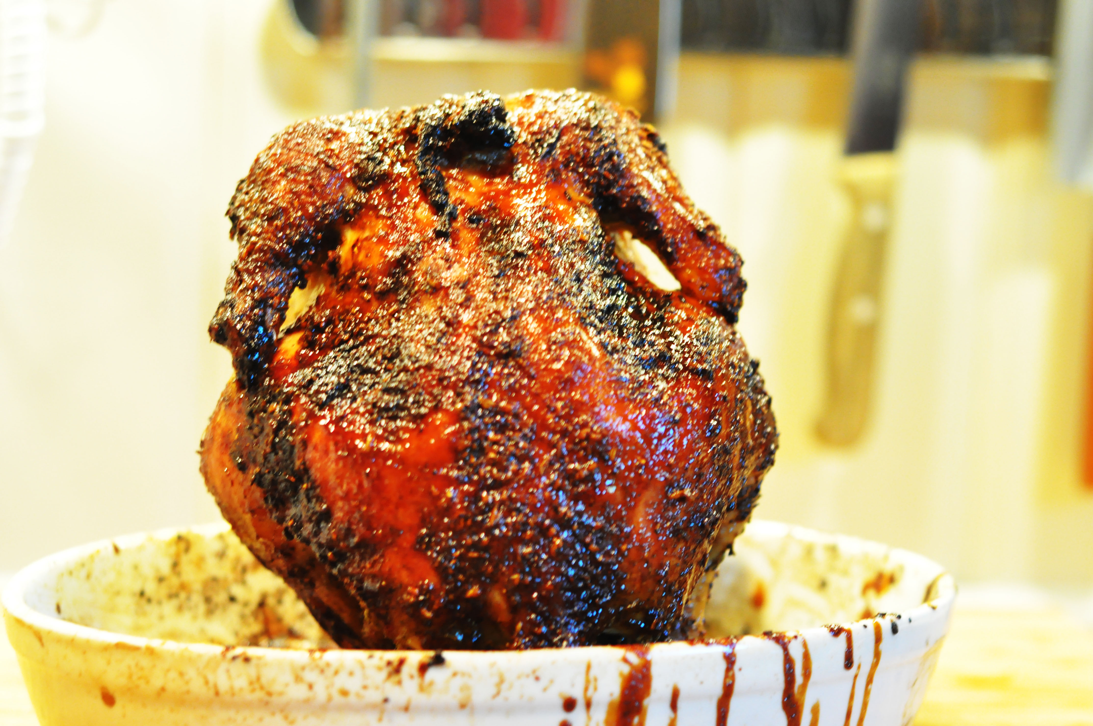6. Når kyllingen har stått inne i ca 1.10 (til den er fin og brun) tar du en pensel og pensler kyllingen godt med glazen. Alle kriker og kroker skal dekkes av umami heaven. La den stå 10 minutter til og kyllingen er klar for kamp. Det ble en fantastisk saftig liten sak, som er klissete, salt, søt og generelt fantastisk digg.