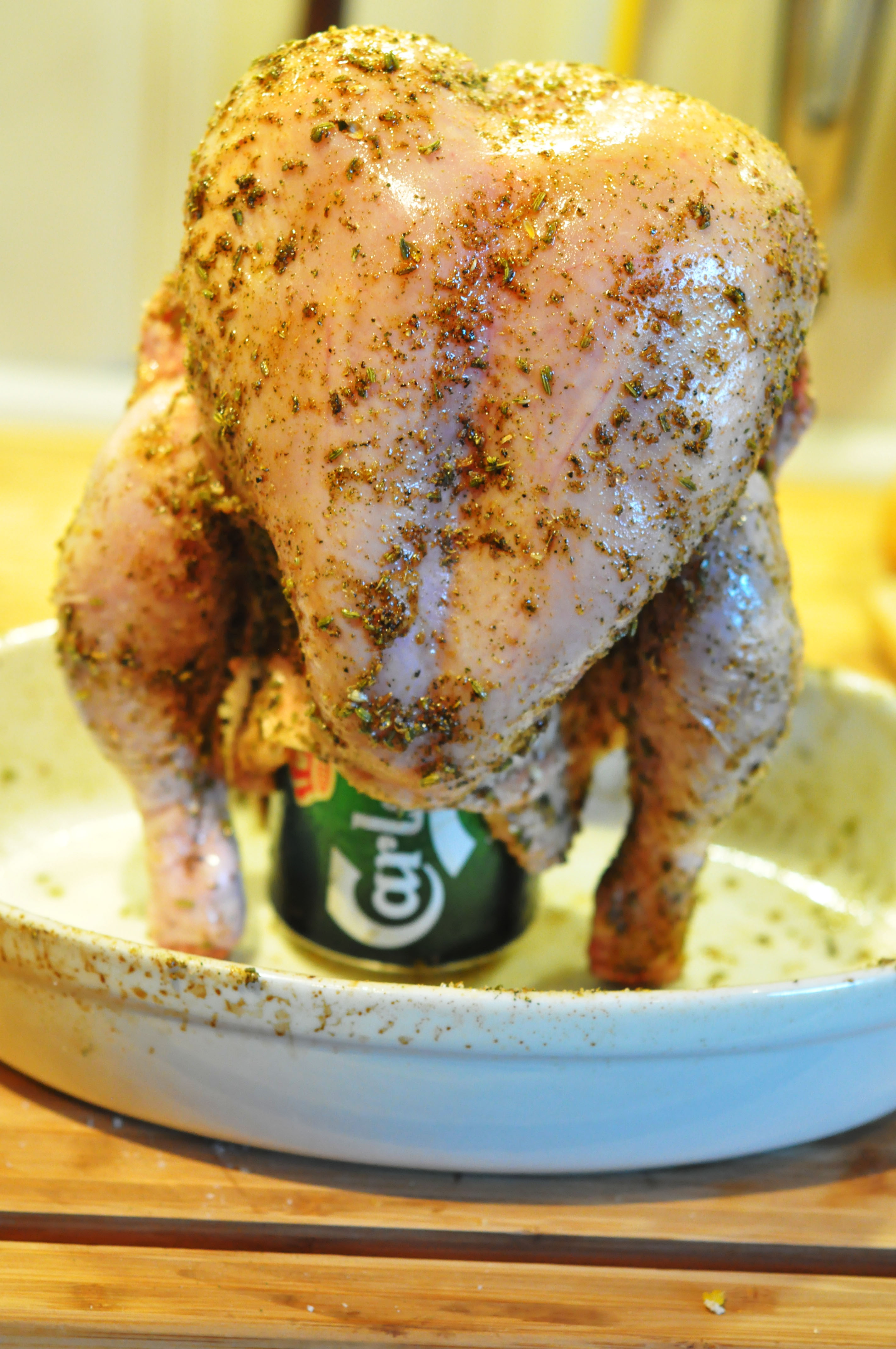 2. Ta en ildfast og sett kyllingen over en 3/4 full boks med øl og sett i ovnen på 200 grader i ca 1.10 minutter, så kjørte jeg på med røyk fra pistolen inn i ovnen for å få til røyksmak på det også.