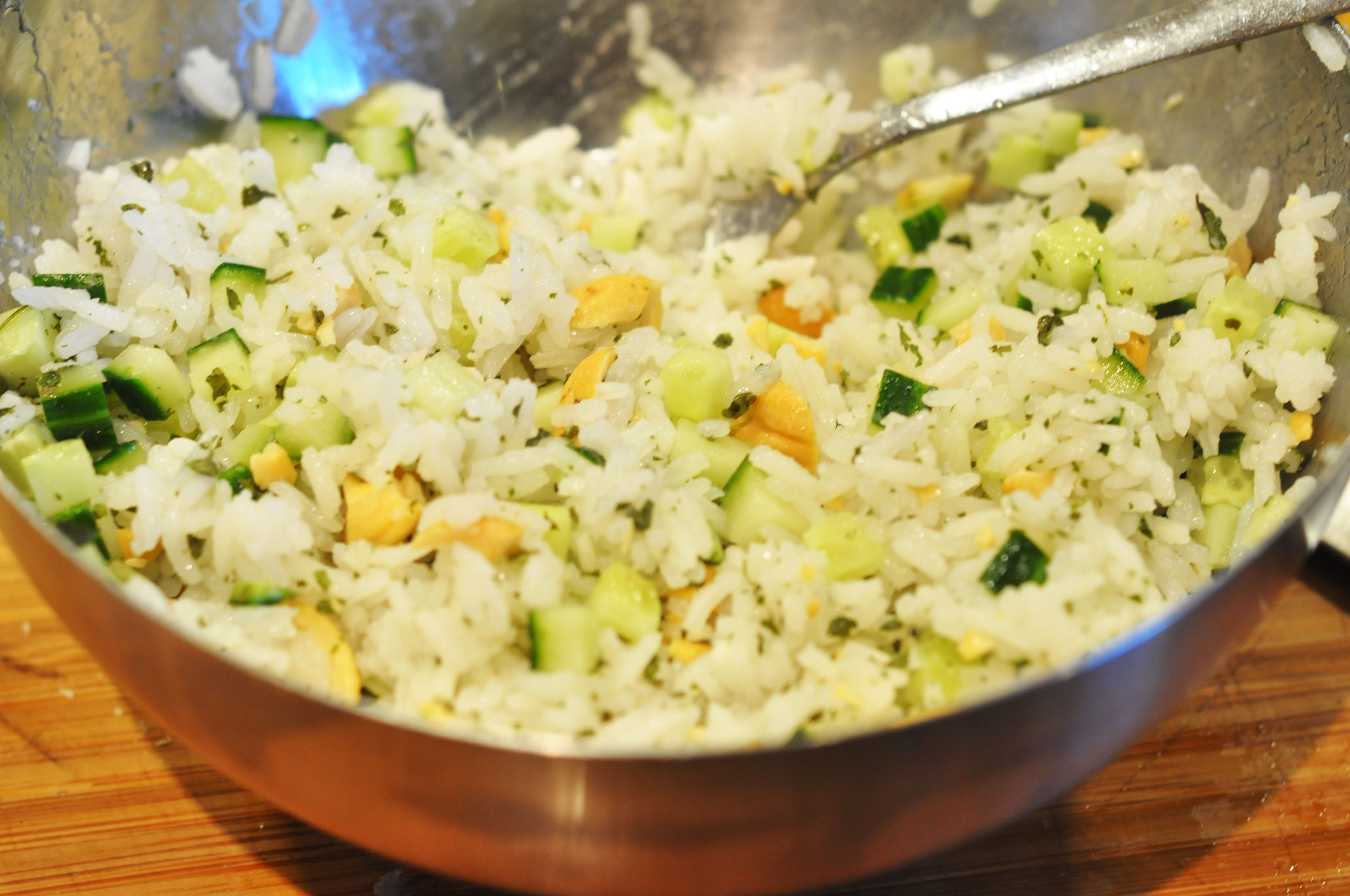 5. Nå er tiden inne for å sette på risen. Kok denne ferdig og tilsett koriander, agurk, nøtter og skvis lime over. Dette er et perfekt frisk liten saktil å følge den smaksrike sausen og kyllingen.