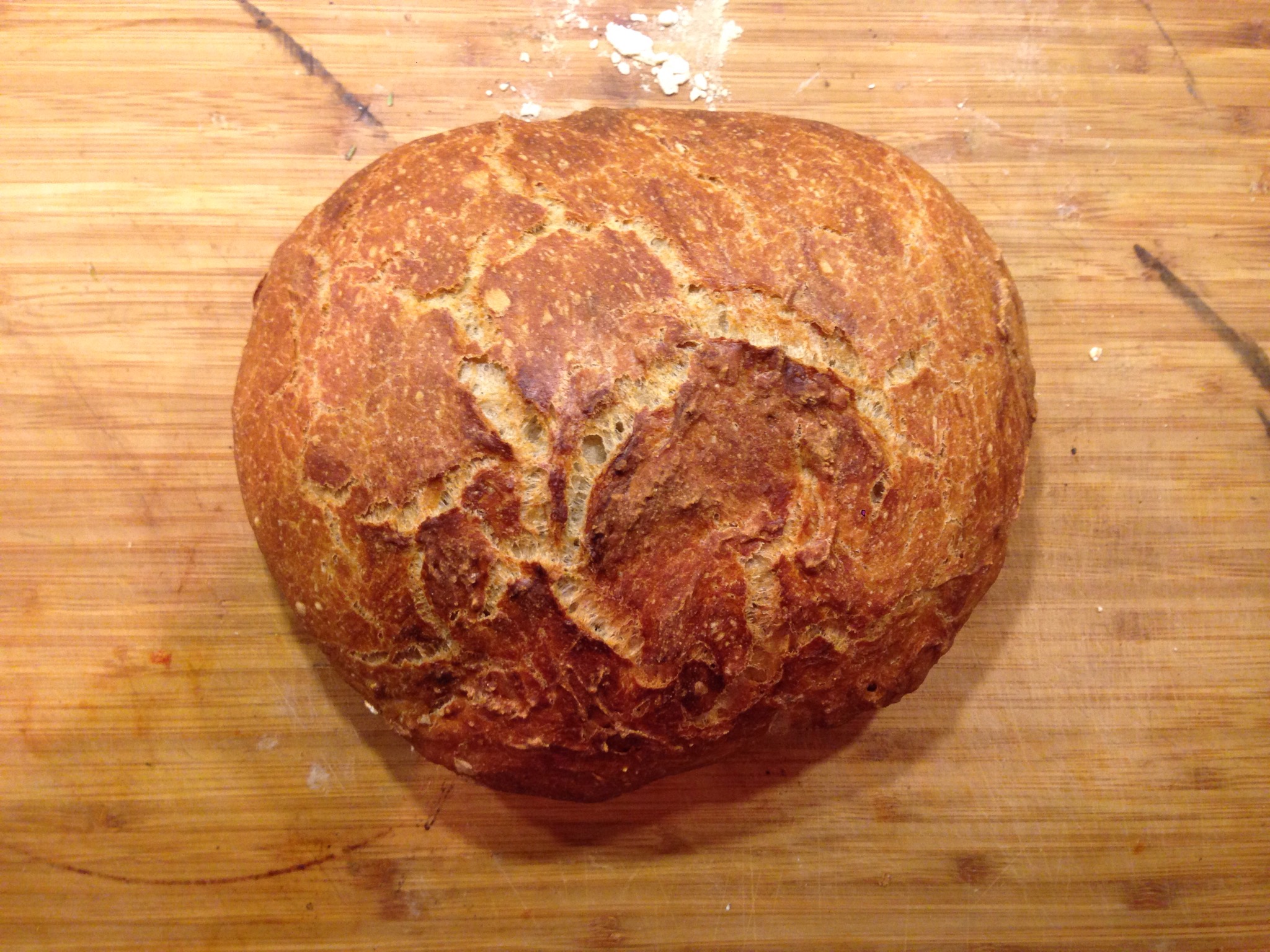 3. Ta gryten ut, jeg liker å helle litt havgryn i bunnen som klistrer seg til brødet og som gir god smak og helle deigen over i kjelen. Sett på lokket og la stå i ovnen på 250 grader i 30 minutter. Ta så av lokket og sett temperaturen på 200 grader i 15 minutter. Brødet er klart og kan kjøle seg ned godt før det skal skjæres og fortæres.