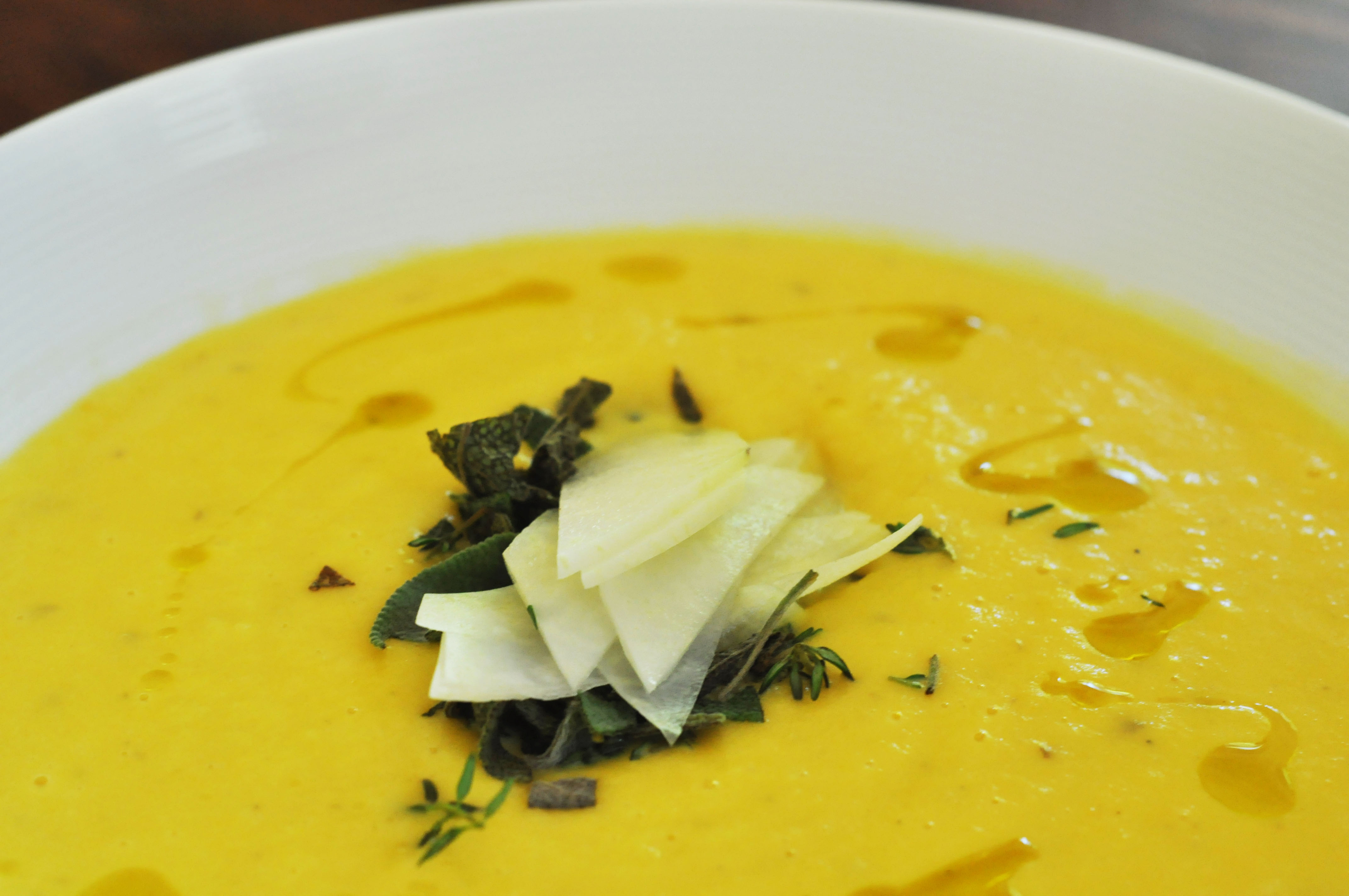 6. Skjære opp knutekålen i tynne skiver, og kutt urtene i små biter. Dette legger du pent i midten av suppen og runder alt av med litt olivenolje eller trøffelolje som jeg brukte her.