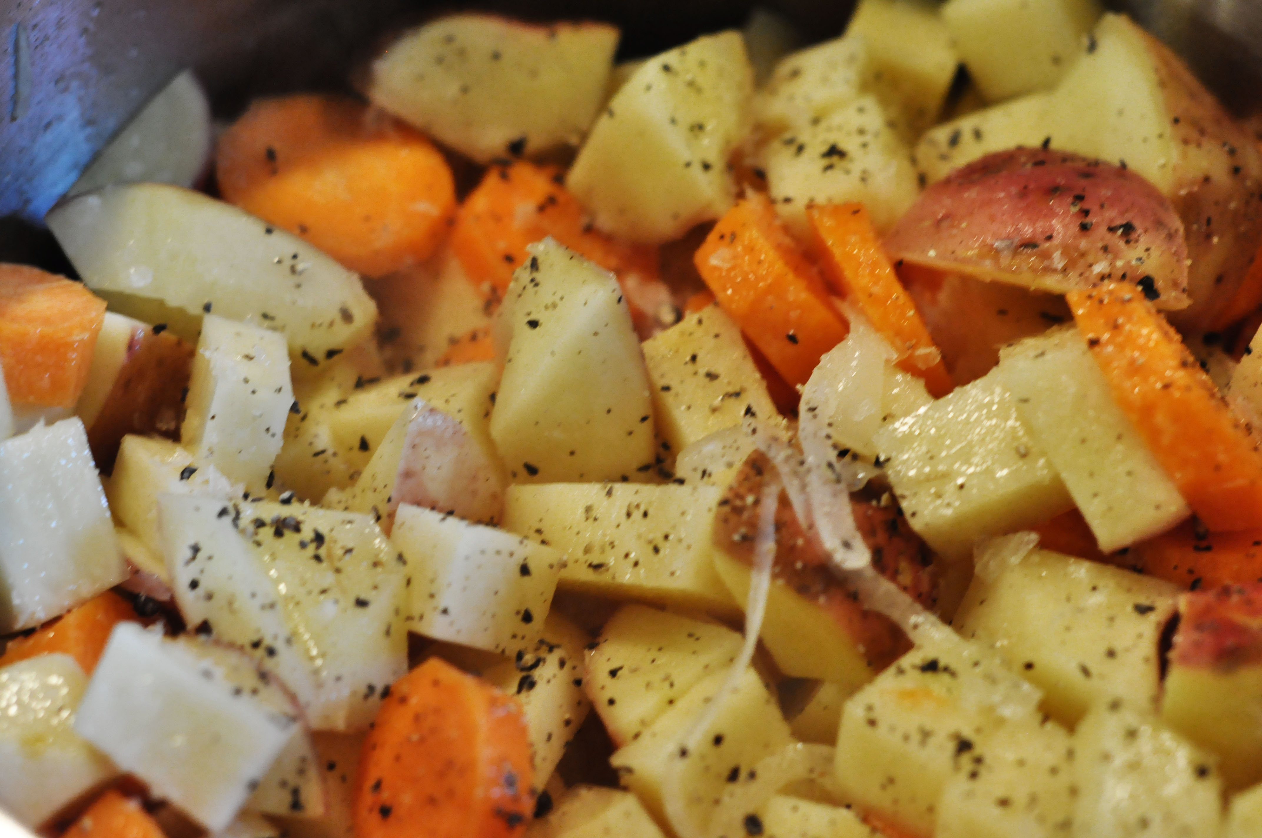 4. Hell over vannet som er blandet ut med buljongterningene. Vannet skal såvidt dekke grønnsakene.