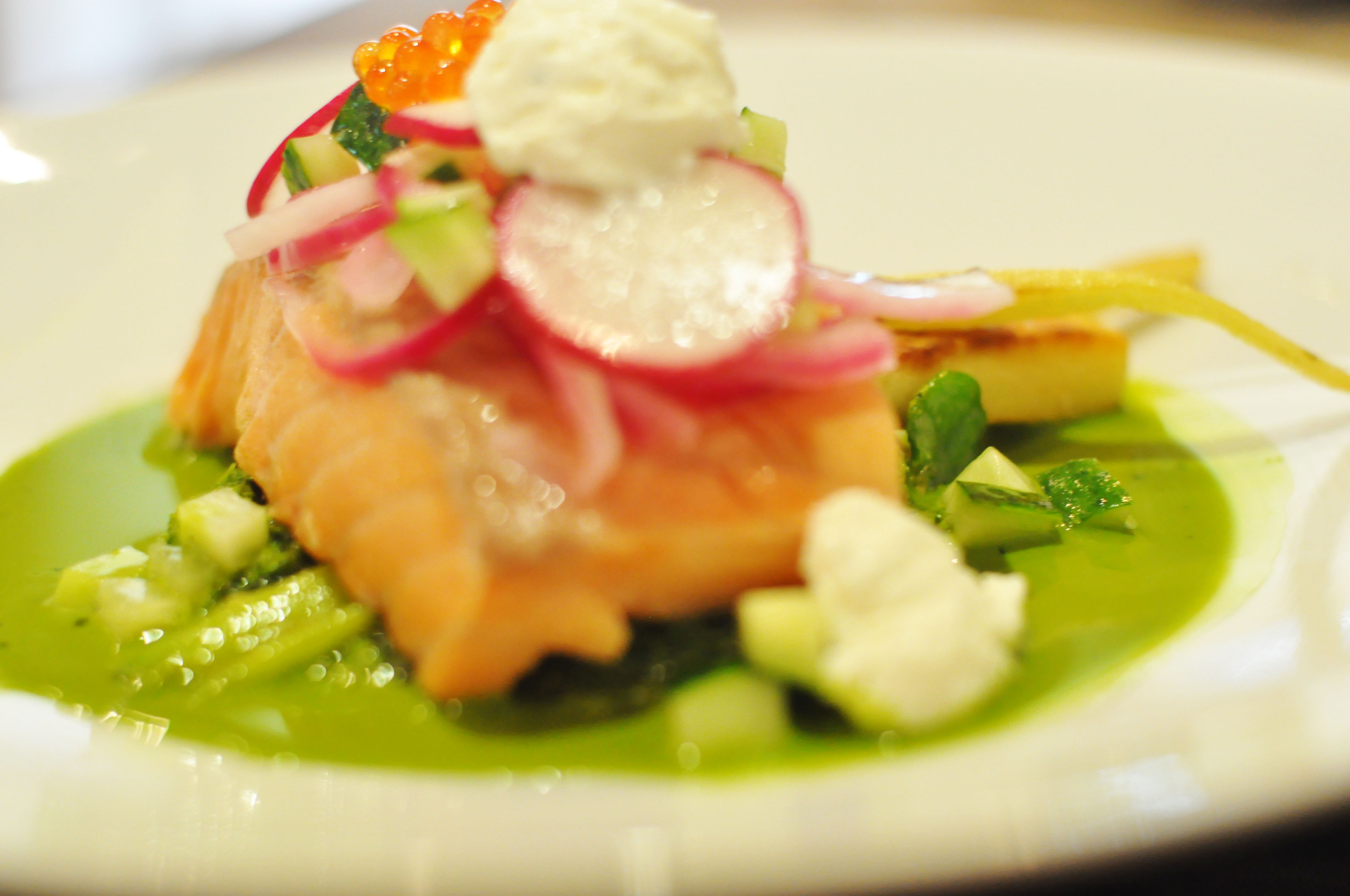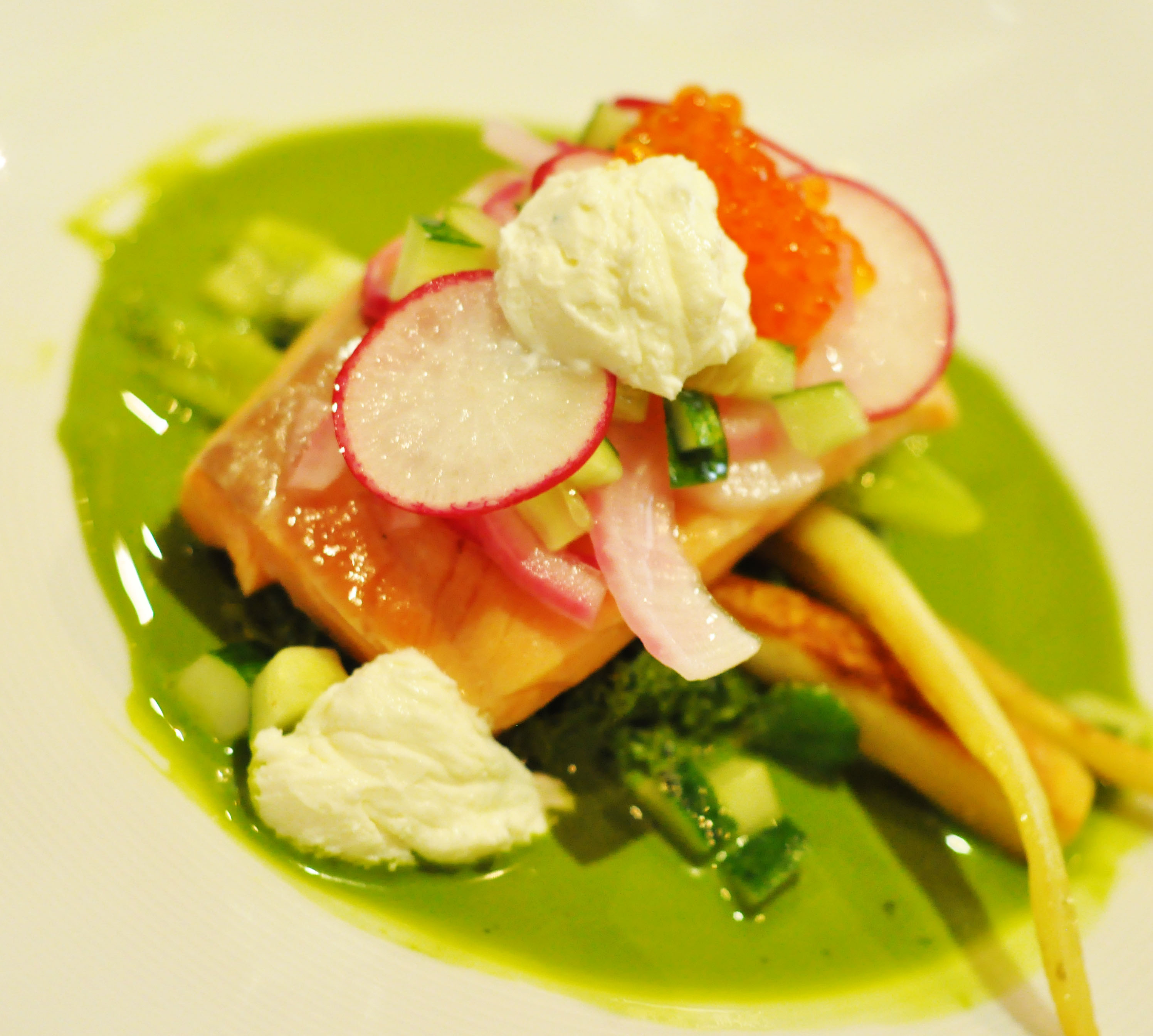 7. Alt er nå klart, så start med å legge grønnkålen nederst, deretter noen pastinakkstaver, vårløk og bønner. Laksen legger du så over dette og topper med syltet rødløk, noen tynt skåret reddiker, agurken og legg litt fetakrem rundt. Topp det hele med litt ørret eller lakserogn om du har, da får en du fin overraskelse av salt når du spiser.