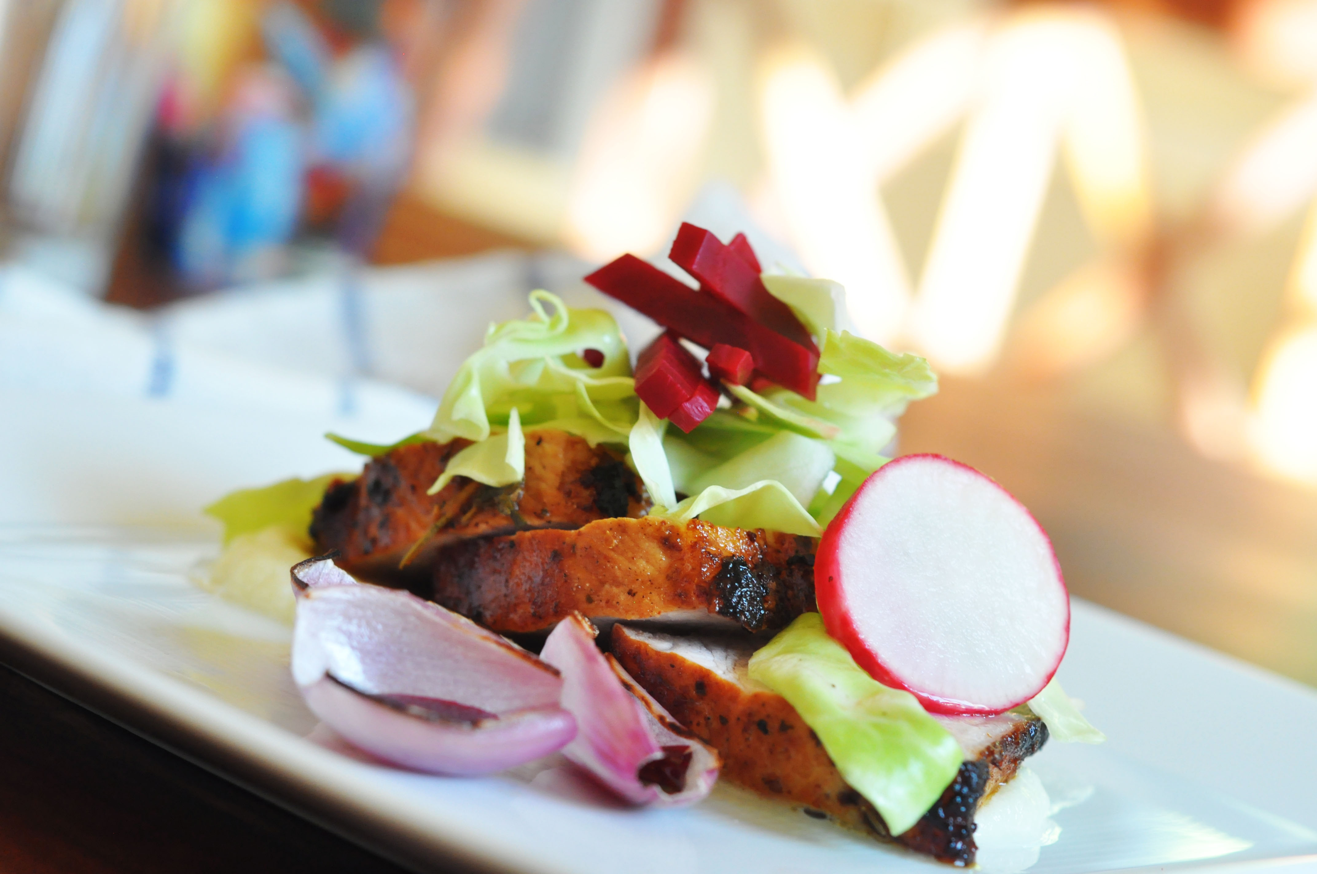 Anrett på tallerken med feta- og blomkålkremen i bunn, kjøtt over og kål med rødbeter på toppen, dryss forsiktig litt av laken over det hele.