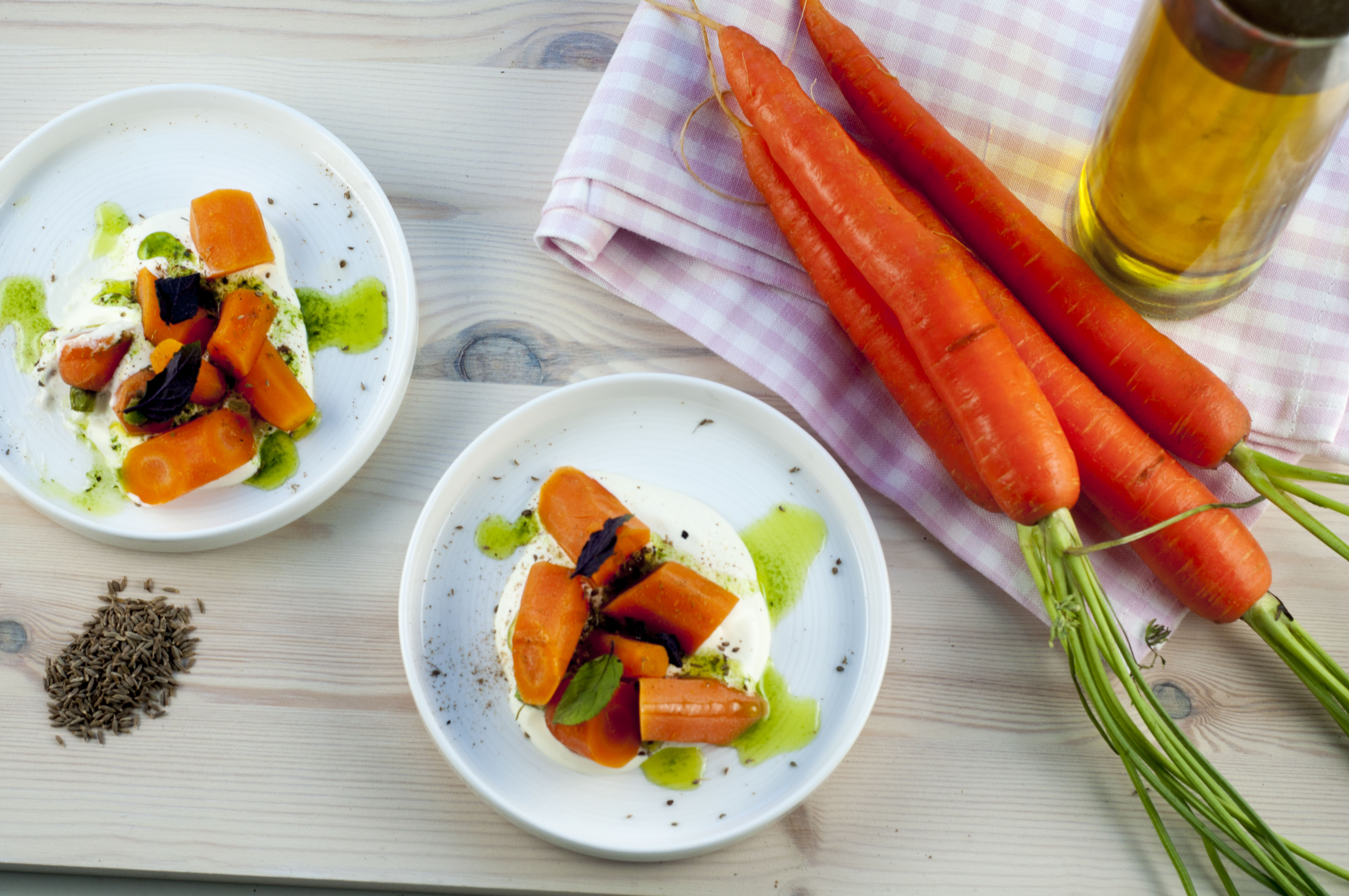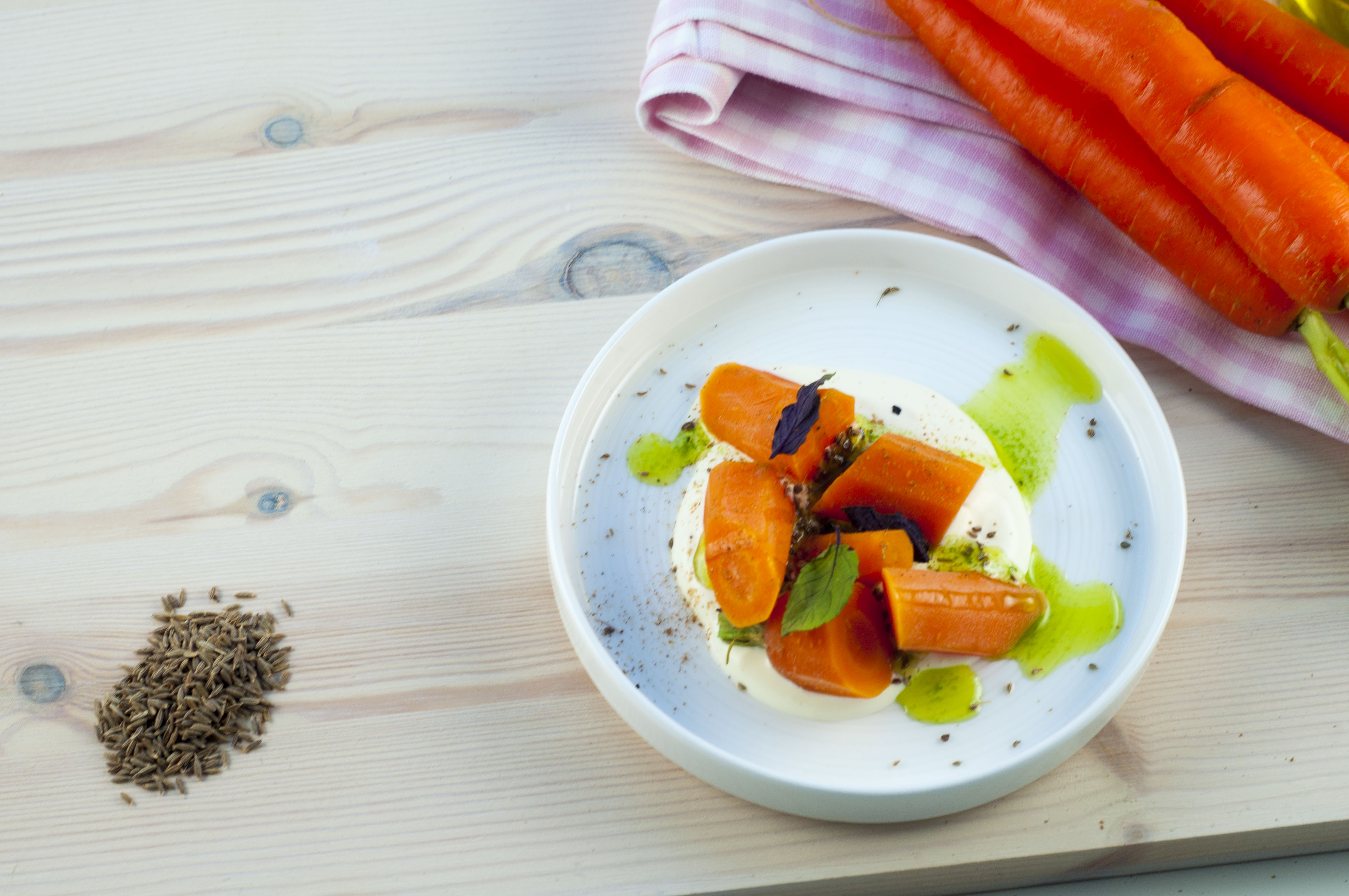 2. Finn frem resten av ingrediensene. Start med å legge en skje med creme fraiche i bunn av tallerken, legg gulrøttene over. Dryss deretter litt ajwan frø og garam masala før du heller litt urteolje over gulrøttene. Helt til slutt legger du på litt mynte og en skvis med sitronsaft.