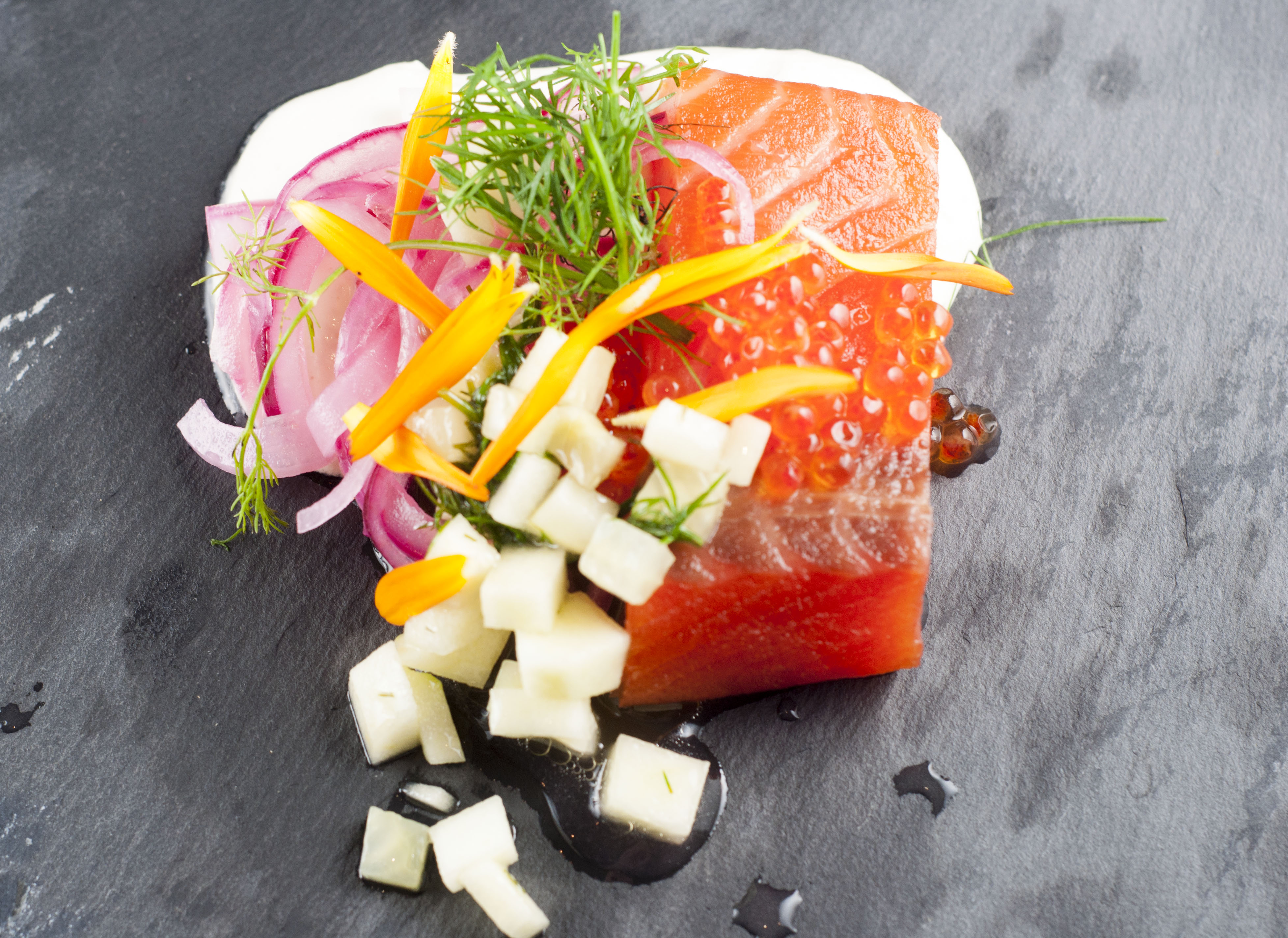 5. Når du skal anrette tar du laksen ut av folien, skyller den i kaldt vann og tørker av med papir. Skjær nå opp i porsjonsstykker.