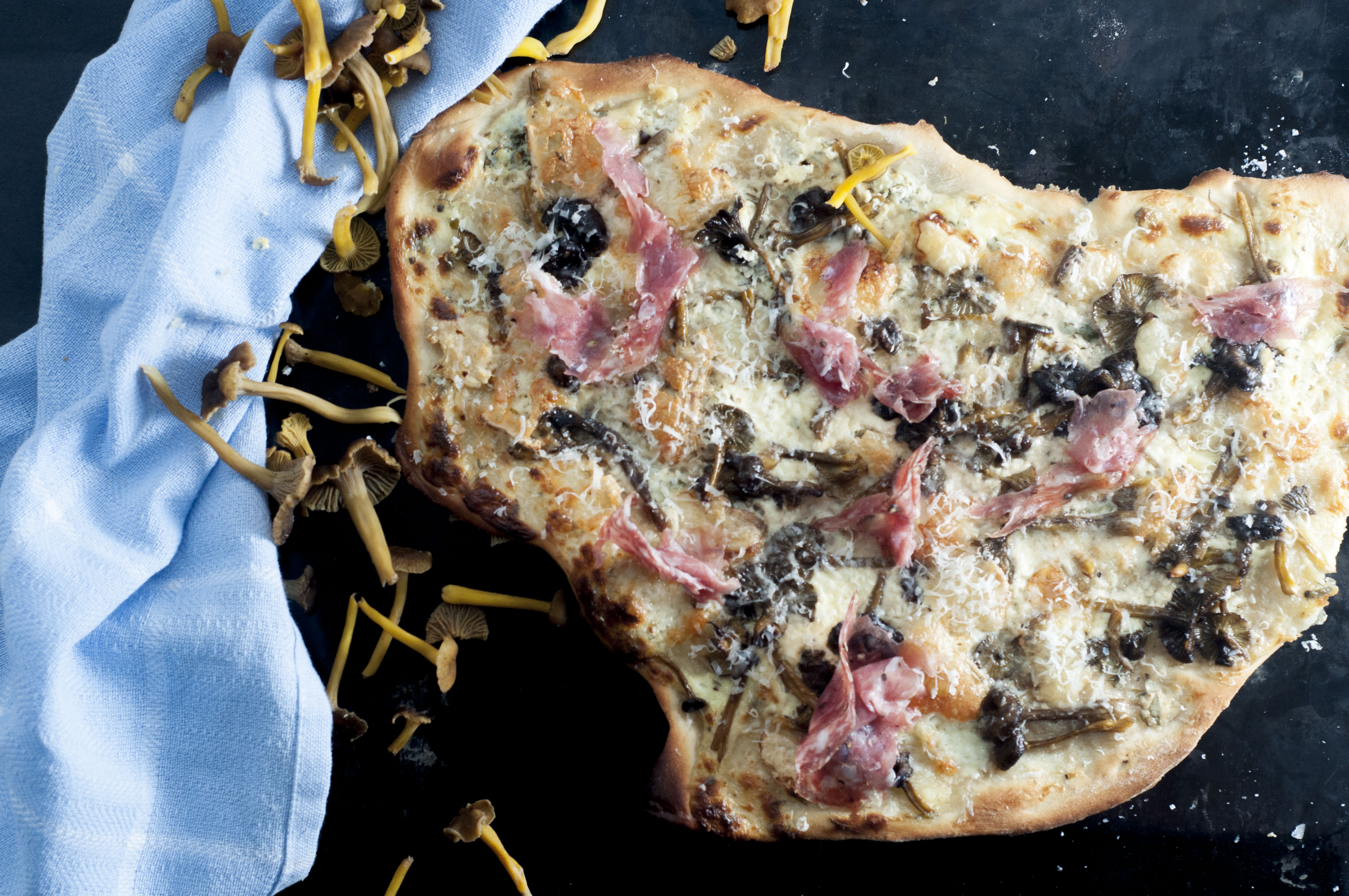 5. Rør nå ut deigen til en tynn pizza, spre creme fraiche godt utover bunnen. Tilsett så soppen over og spre litt talleggio rundt på pizzaen. Stek den så i 10 minutter på 250 grader.