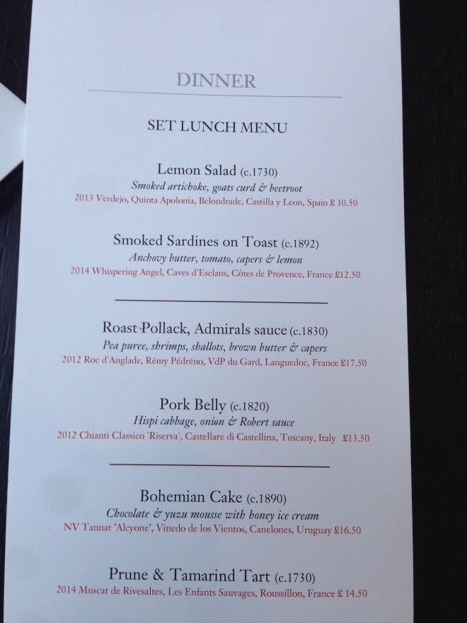 Jeg var der til lunsj med en kompis, og her får du virkelig verdi for pengene. En treretters lunsjmeny til den nette sum av 38 pund er noe man virkelig kan ta seg råd til og slett ikke langt unna egons. Det er historisk preg på rettene her, og man har hentet inspirasjon fra laangt tilbake i tid.